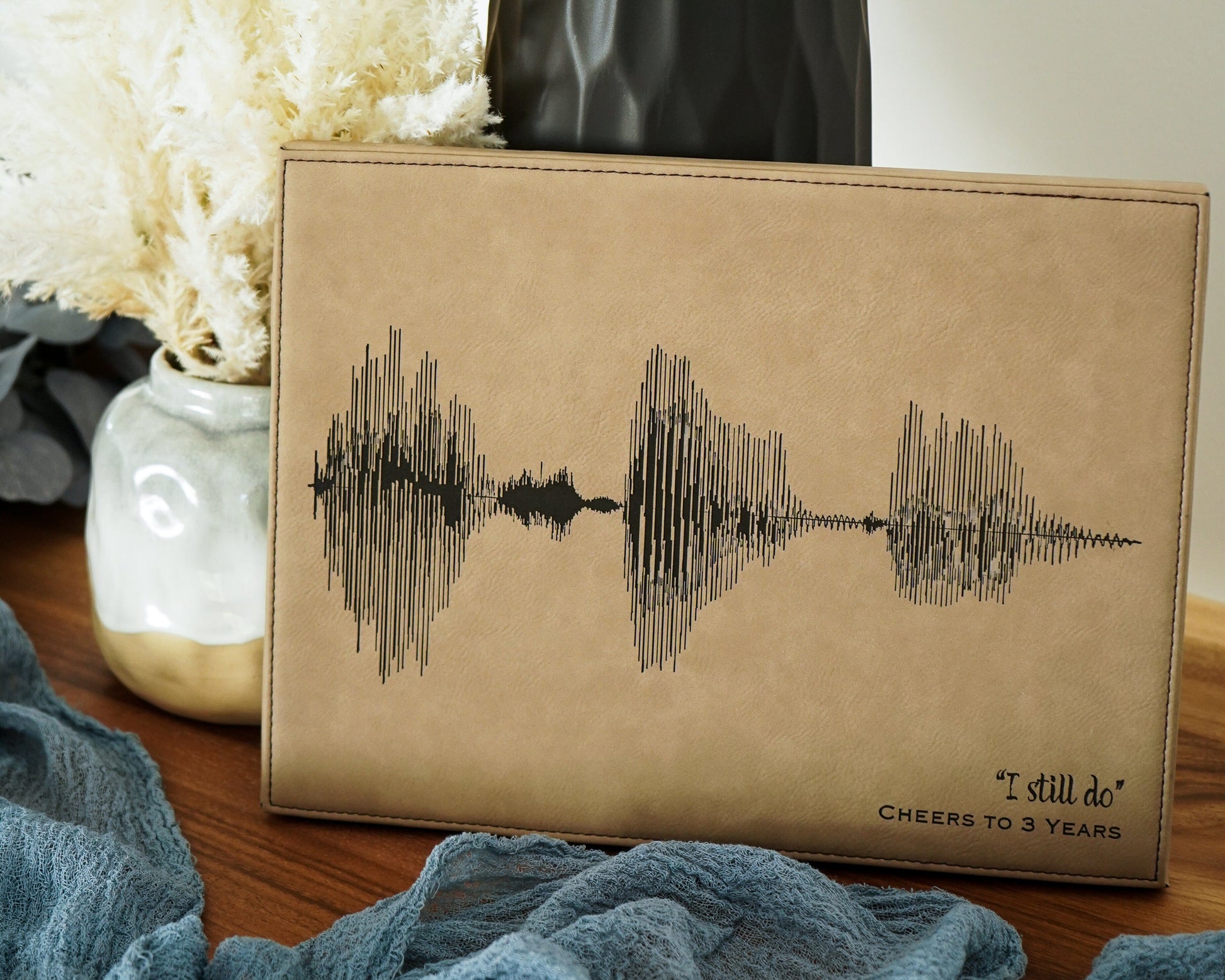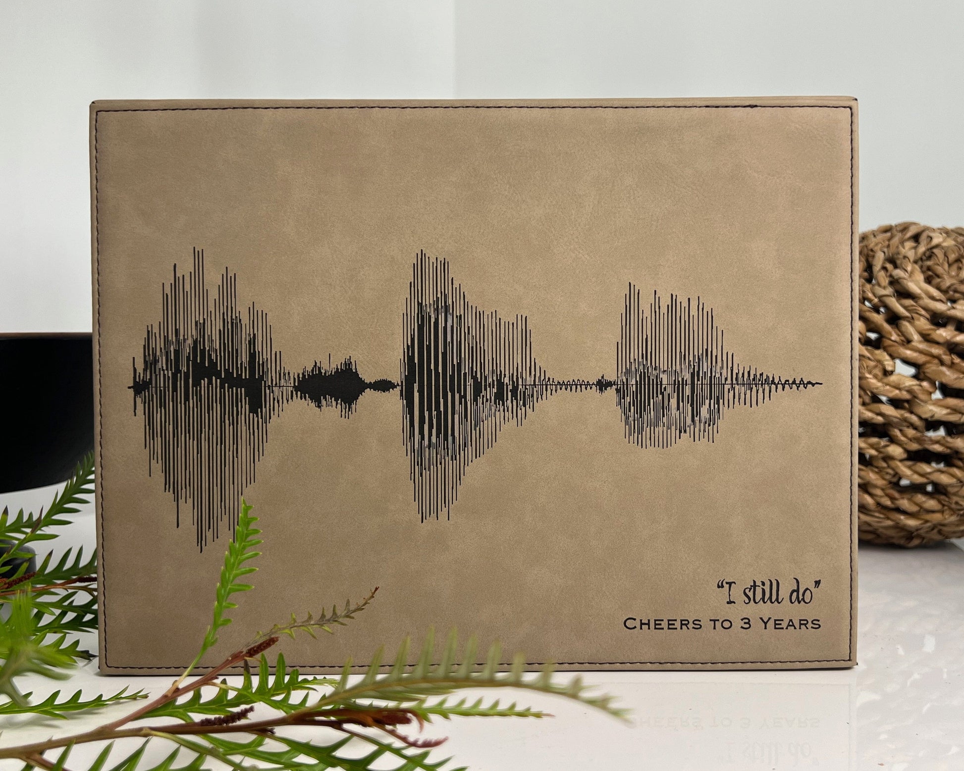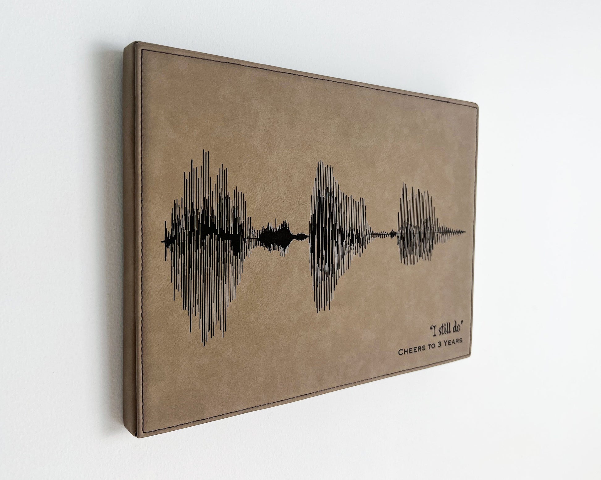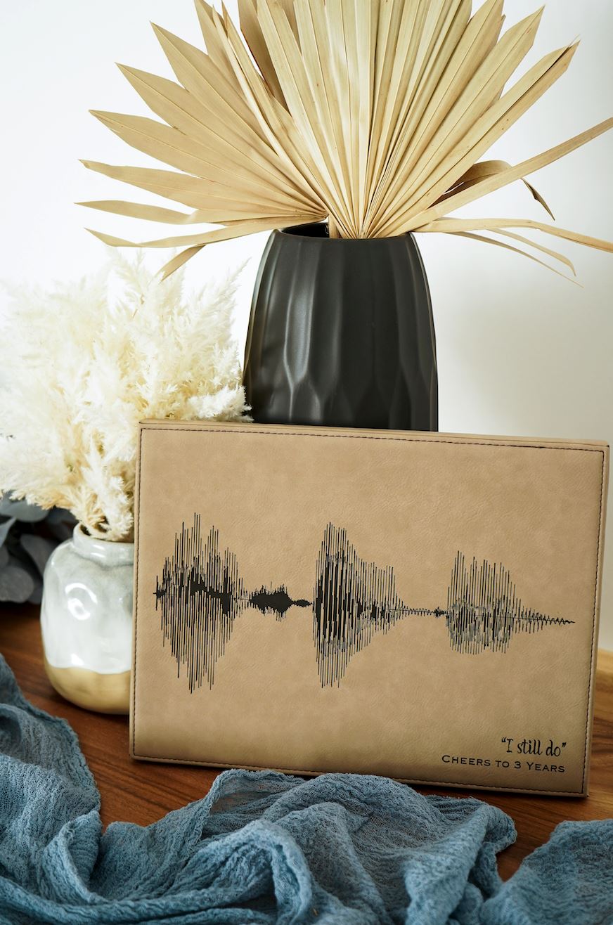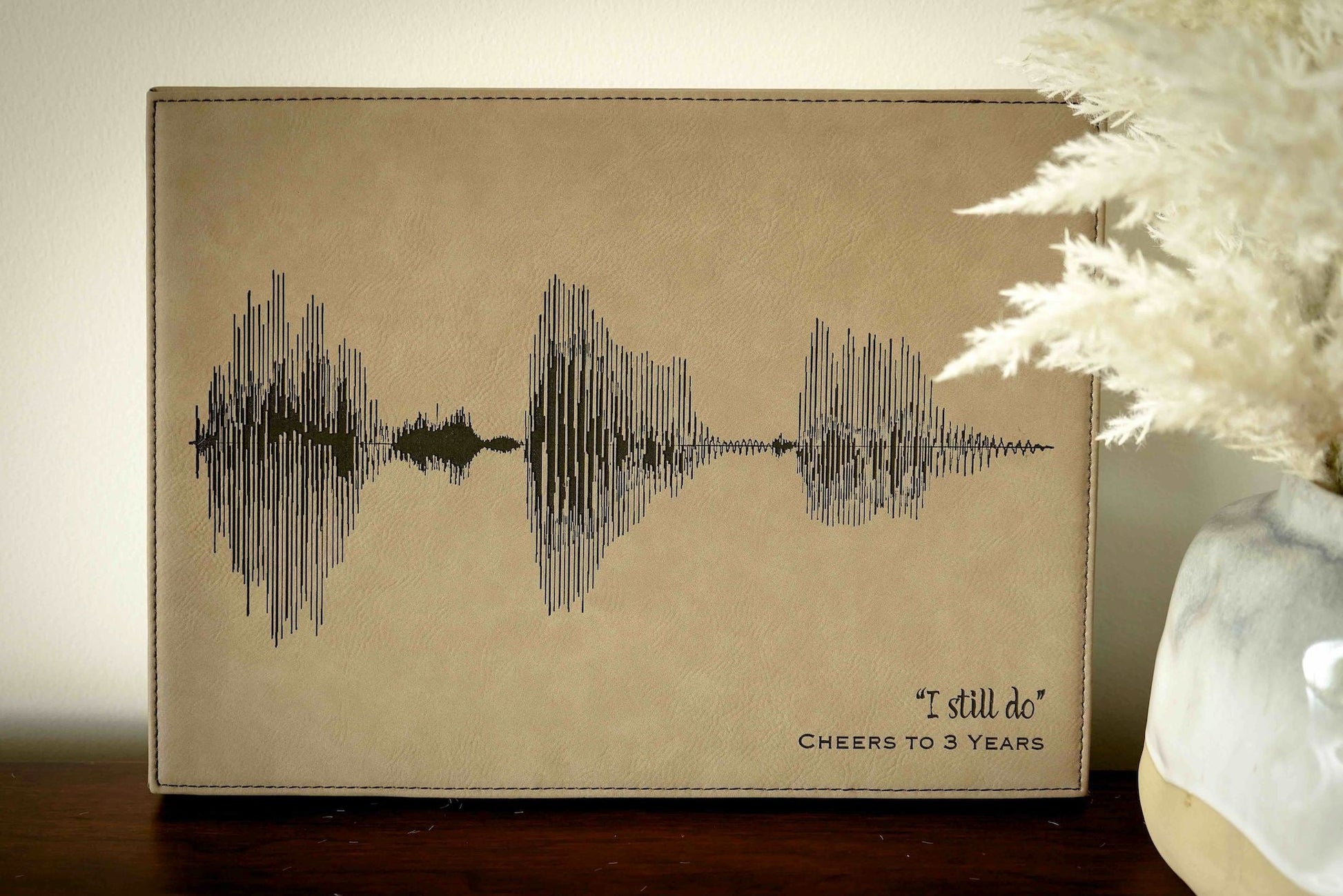 Celebrate your 3rd wedding anniversary with a truly unique and meaningful gift: a custom leather sound wave art print of your wedding song. This personalized anniversary gift is sure to be cherished by your husband for years to come.