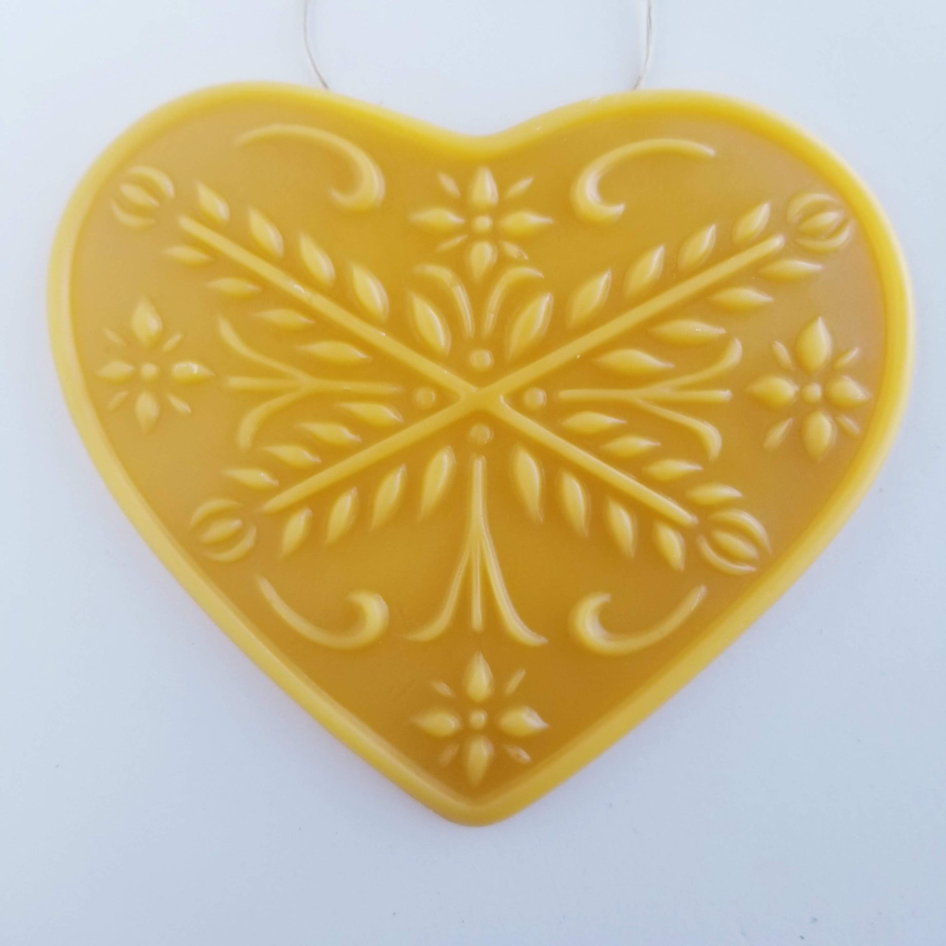 Choose between unscented natural yellow beeswax or our wonderfully fragrant antiqued cinnamon finish. Both have a twine loop for hanging. Yellow has no added scent, but retains its subtle honey aroma. Antiqued cinnamon is made with tinted beeswax and cinnamon oil, with a ground cinnamon rub on the surface. Store in a cool place. Store cinnamon ornaments in an airtight bag between seasons of use to preserve the scent.