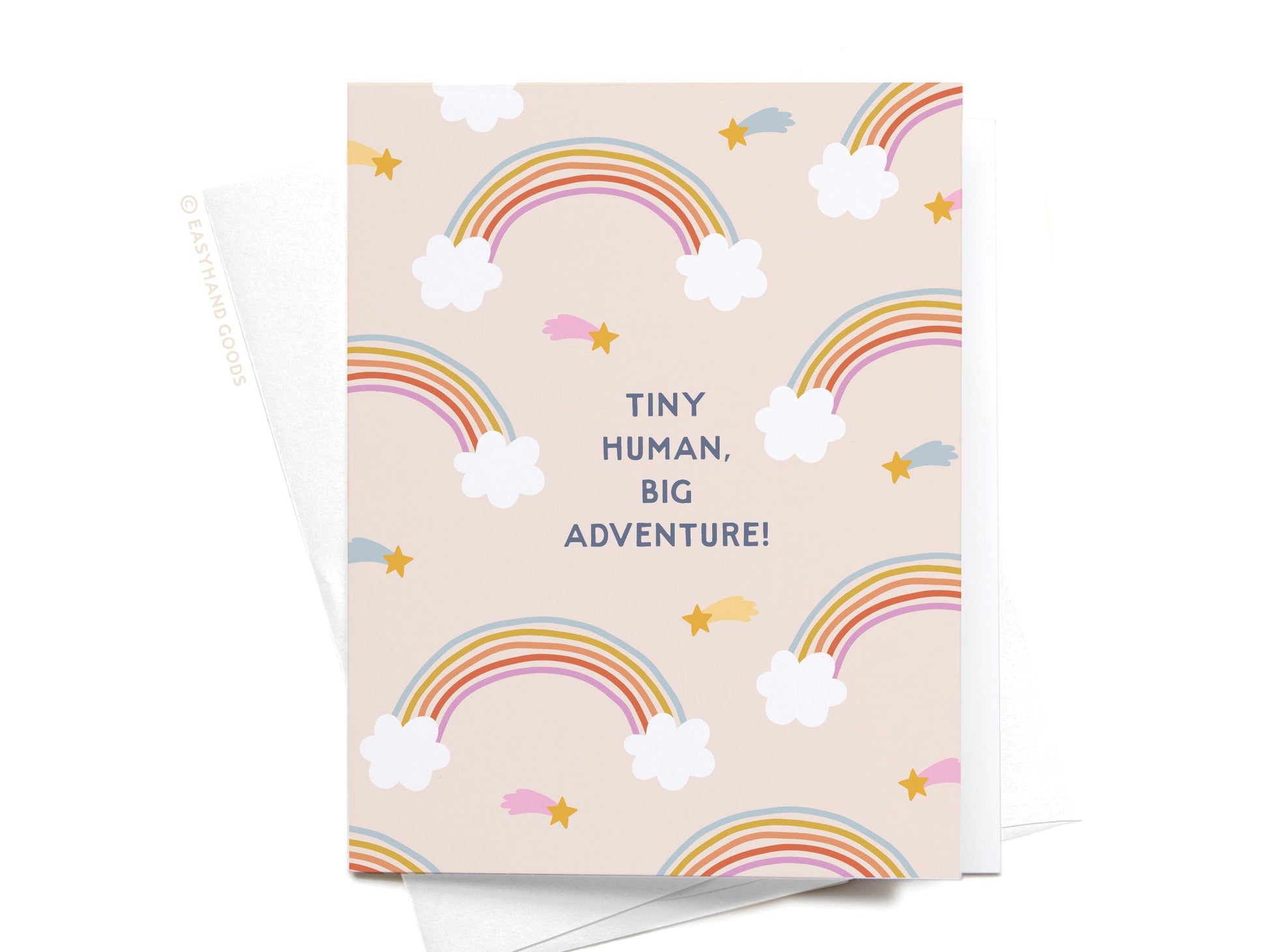 Welcome the little one with the Tiny Human Big Adventure Greeting Card. A sweet new baby card for growing families.
