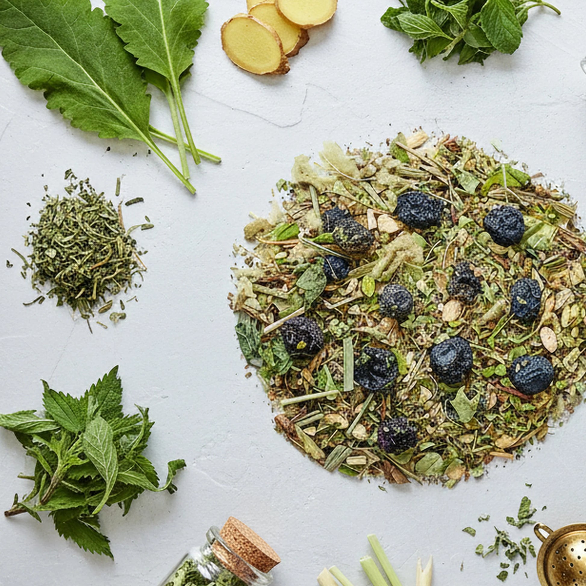 Ingredients: Nettle Leaf, Mullein, Lemongrass, Moringa, Blueberries, Holy Basil, Ginger, Licorice Root