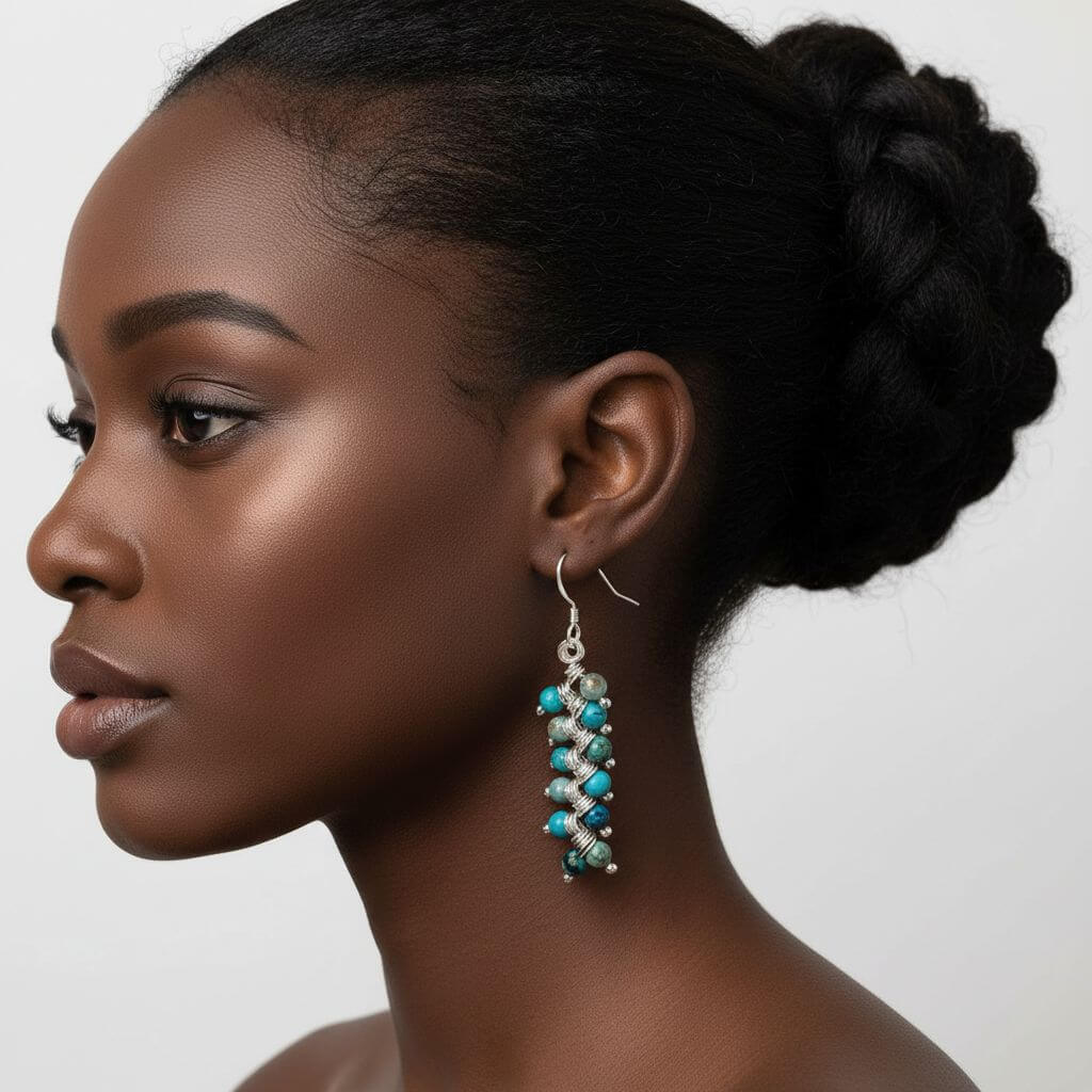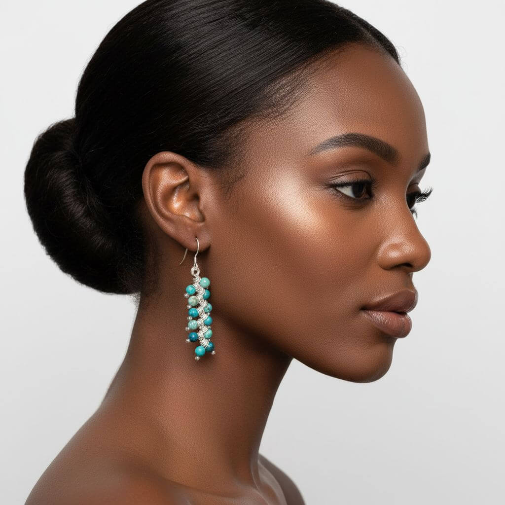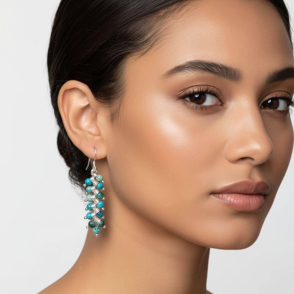 Turquoise has been treasured for centuries for its stunning blue-green hues and protective properties. Our carefully curated mix of turquoise shades creates incredible depth and visual interest—from pale aqua that catches the light to deep teal that adds richness and drama. The natural variation in turquoise color means each pair is truly one-of-a-kind, with its own unique combination of blues and greens. The sterling silver wire adds brilliant contrast while the cluster design creates beautiful movement.