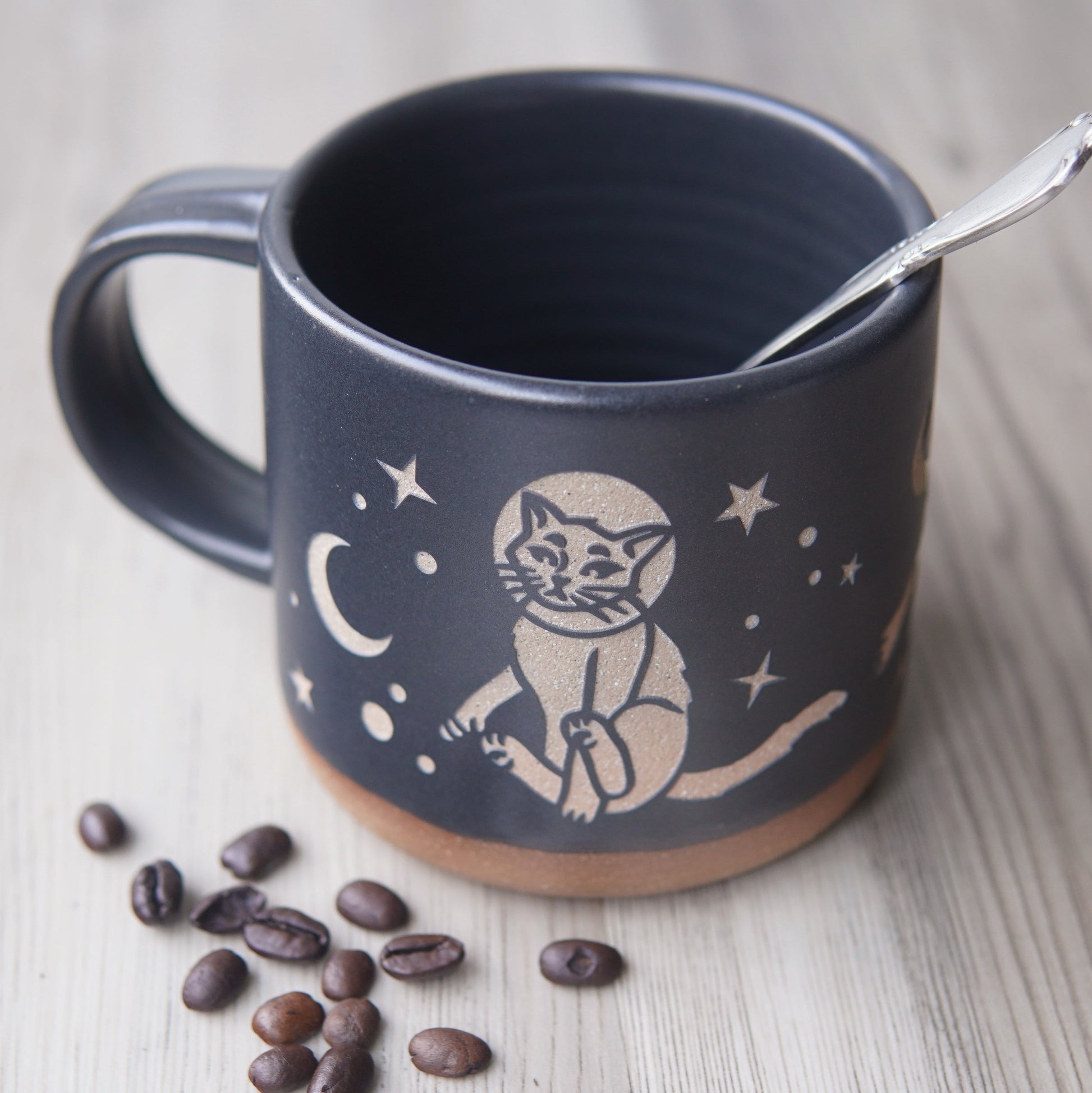 Be part of the coolest space mission around with this awesome astronaut space cats mug! This handmade pottery mug features two cool cats chasing shooting stars, making your morning coffee extra out of this world!