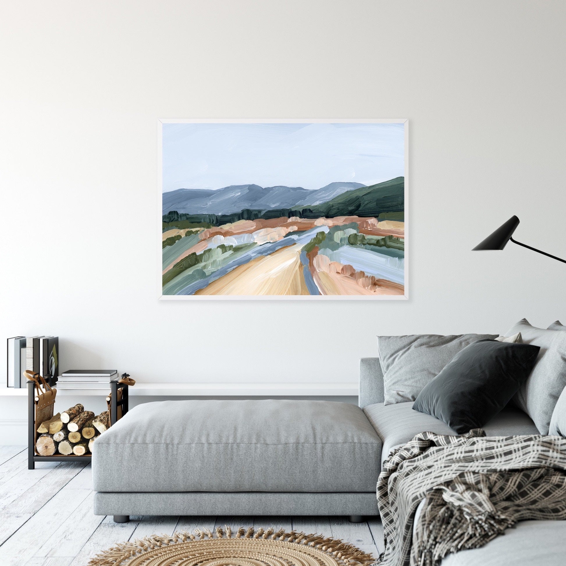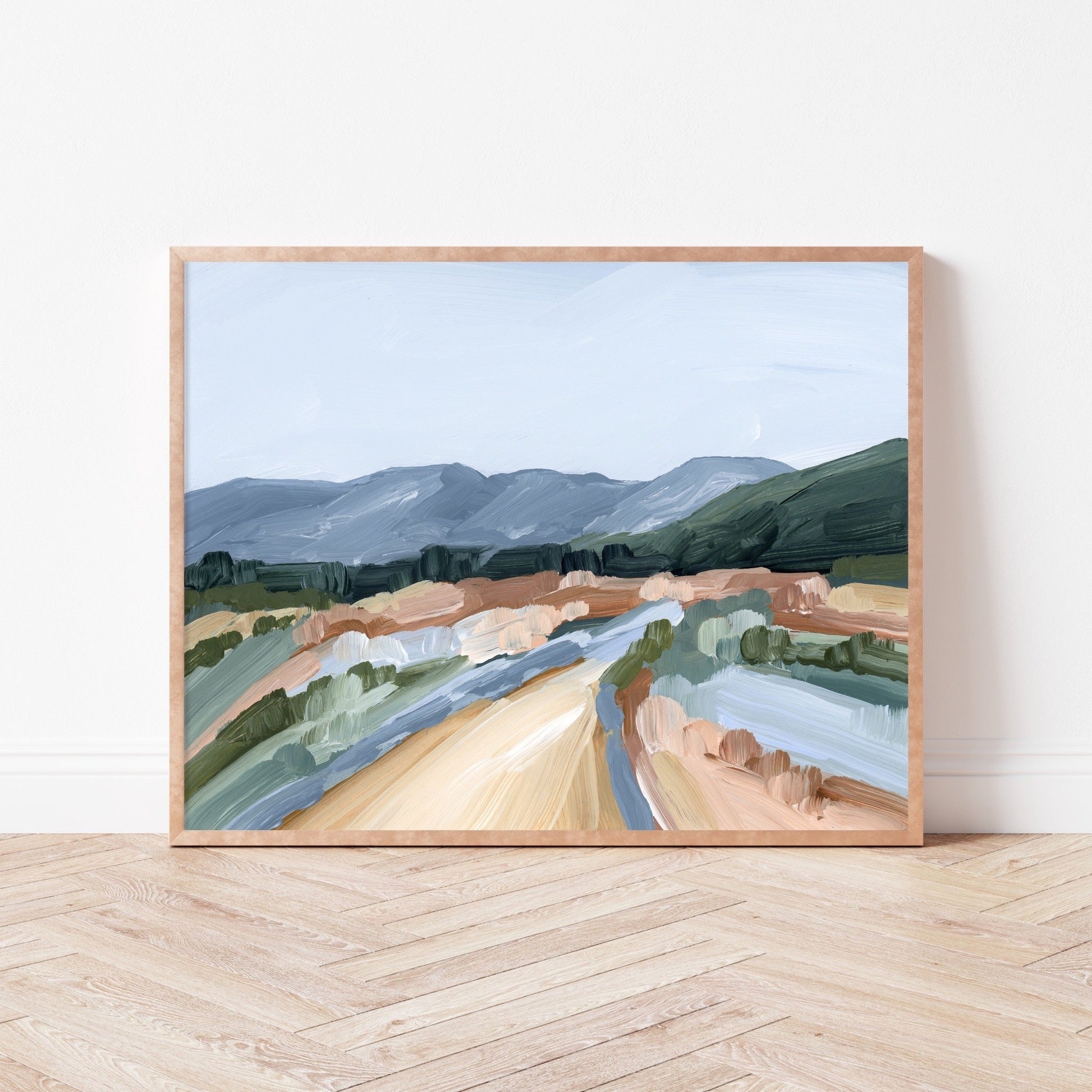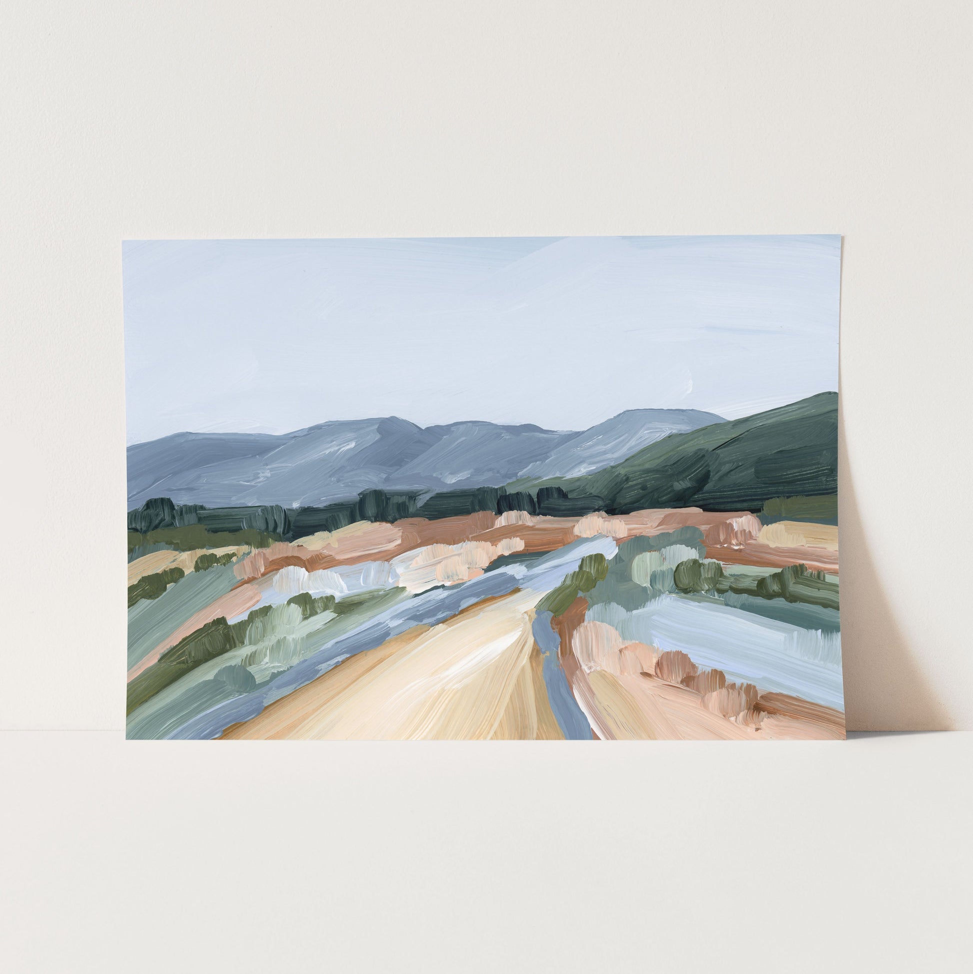 The fine art print of "At Altitude" is a reproduction of an original acrylic landscape painting inspired by the diverse and colorful scenery of Sedalia, Colorado. With playful brushstrokes and vibrant colors, this mountain wall art captures the essence of the iconic Rocky Mountain landscape. Available in a variety of art print sizes, this landscape art print showcases a minimalist, impressionist style and is perfect for bringing the beauty of Colorado into your home.