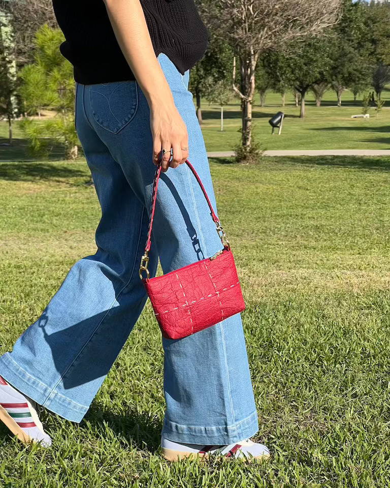 - Materials: Piñatex, an innovative textile made from pineapple leaf fiber. Removable shoulder strap. Top zipper closure. Interior pocket.