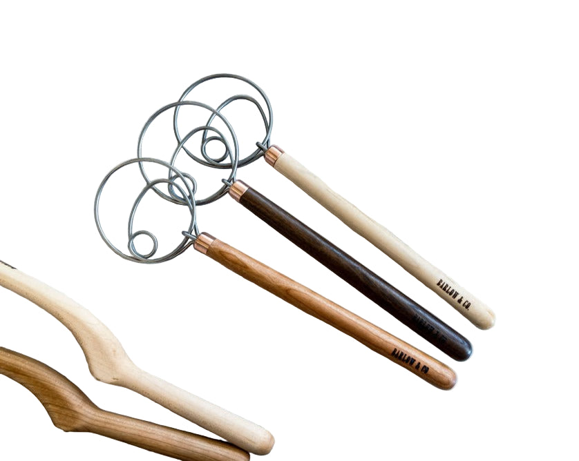 The handle is very comfortable and beautifully crafted from American hardwoods (Walnut, Maple, and Cherry). We use a copper ferrule and heavy gauge stainless steel wire, making our dough hook incredibly durable. These are handmade in the USA by the craftsman of Barlow & Co.