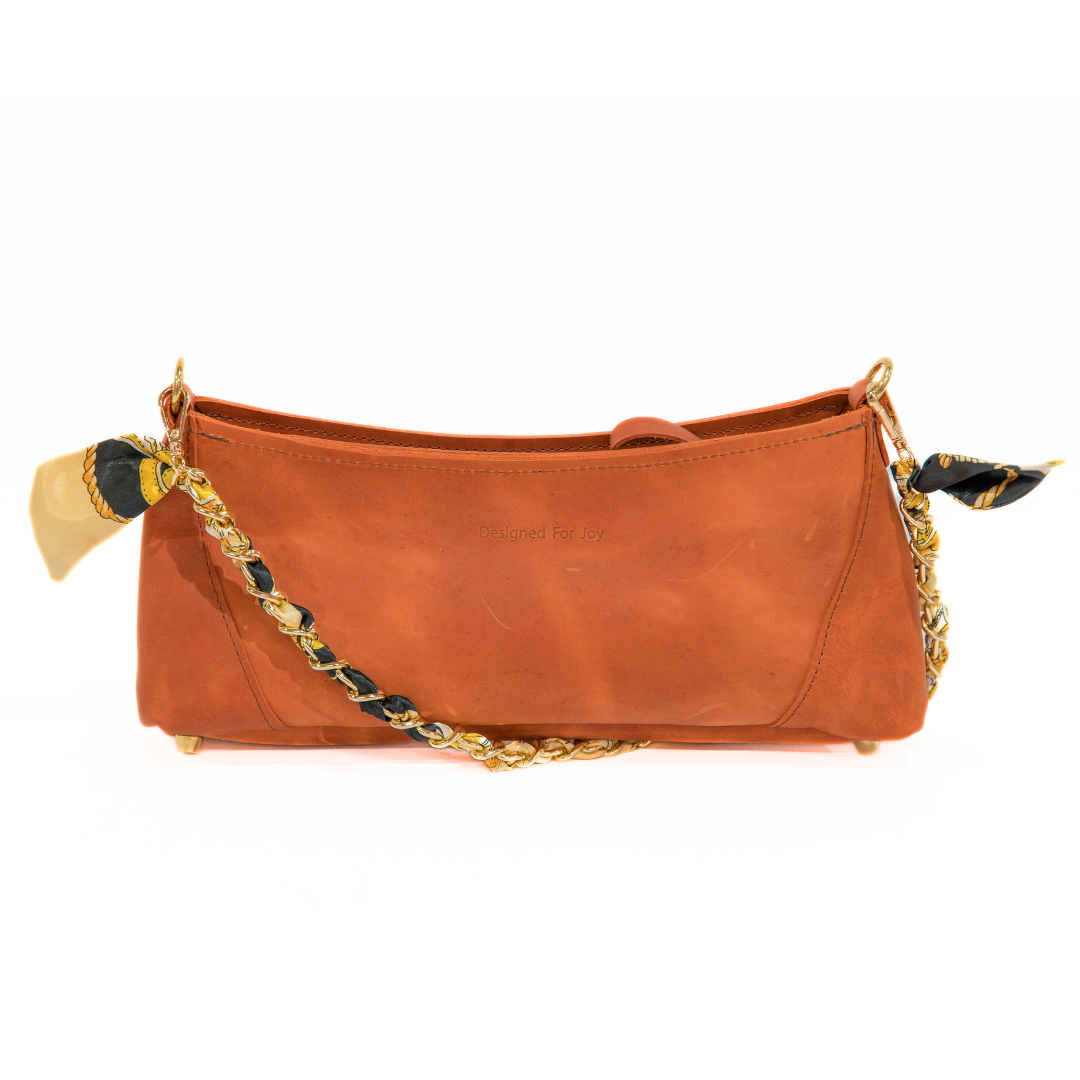 Swoon! We can’t get enough of this adorable leather handbag silhouette, a staff favorite. Great size with a baguette shape. We've paired it with an elegant goldtone chain shoulder strap with a beautiful satin scarf woven through the gold chain.