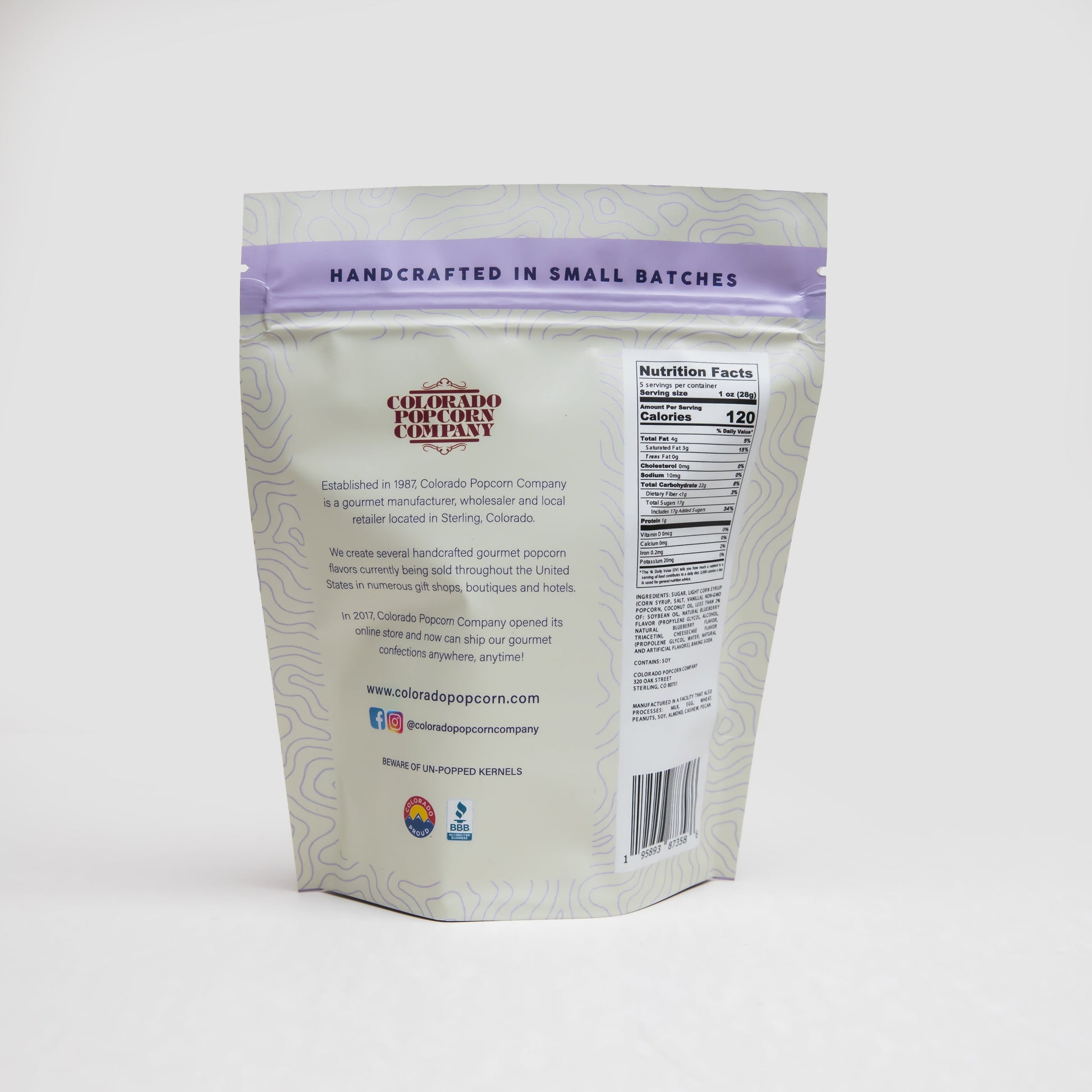 A bag of our Blueberry Cheesecake popcorn. Cheesecake candied popcorn mixed with blueberry candied popcorn. Distinctively flavorsome!