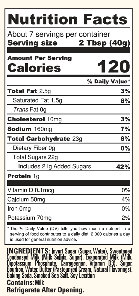 Ingredients: Invert Sugar (Sugar, Water), Sweetened Condensed Milk (Milk Solids, Sugar), Evaporated Milk (Milk, Dipotassium Phosphate, Carrageenan, Vitamin D3), Sugar, Bourbon, Water, Butter (Pasteurized Cream, Natural Flavorings), Baking Soda, Bourbon Smoked Sea Salt, Soy Lecithin