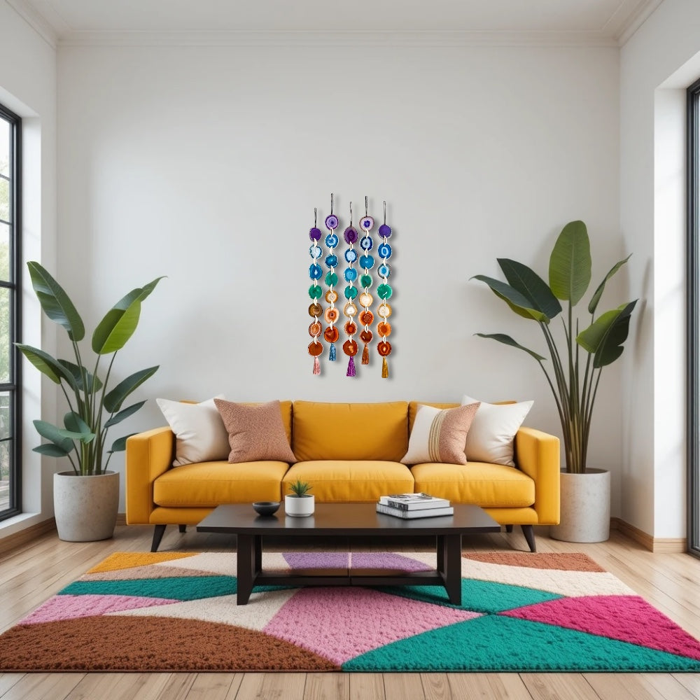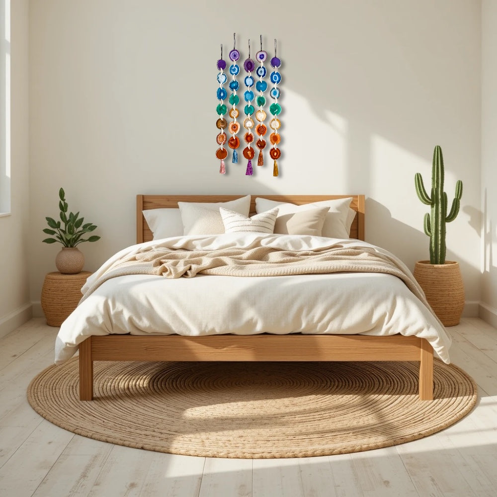 Introducing the Chakra Harmony Agate Garland Wall Hanging, a handcrafted masterpiece designed to infuse your home with harmony and positive energy. This exquisite wall hanging features seven vibrant agate slices, each representing the colors of the chakras, meticulously selected to bring balance and serenity to your space.