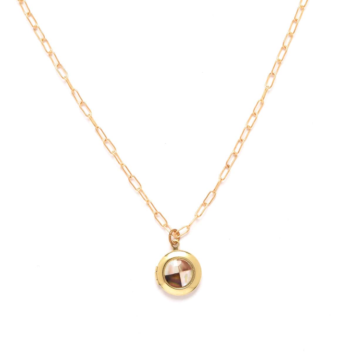 - Vintage brass round locket with vintage checkered shell cabochon with Mother of Pearl and Abalone