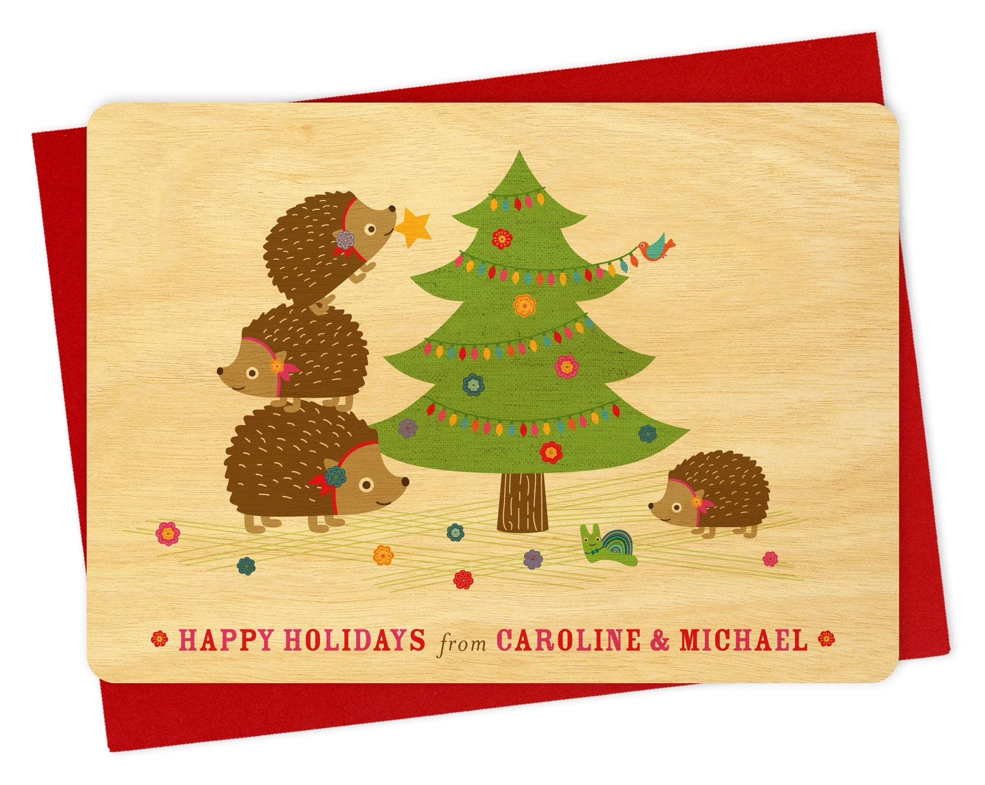 Celebrate the season with our Christmas Hedgies holiday cards featuring a sweet family of hedgehogs decorating a tree on a warm birch wood grain background. Printed on your choice of real wood or eco-friendly paper, these custom cards are simple to customize with and perfect for sending warm wishes to clients, colleagues and friends. To get started: