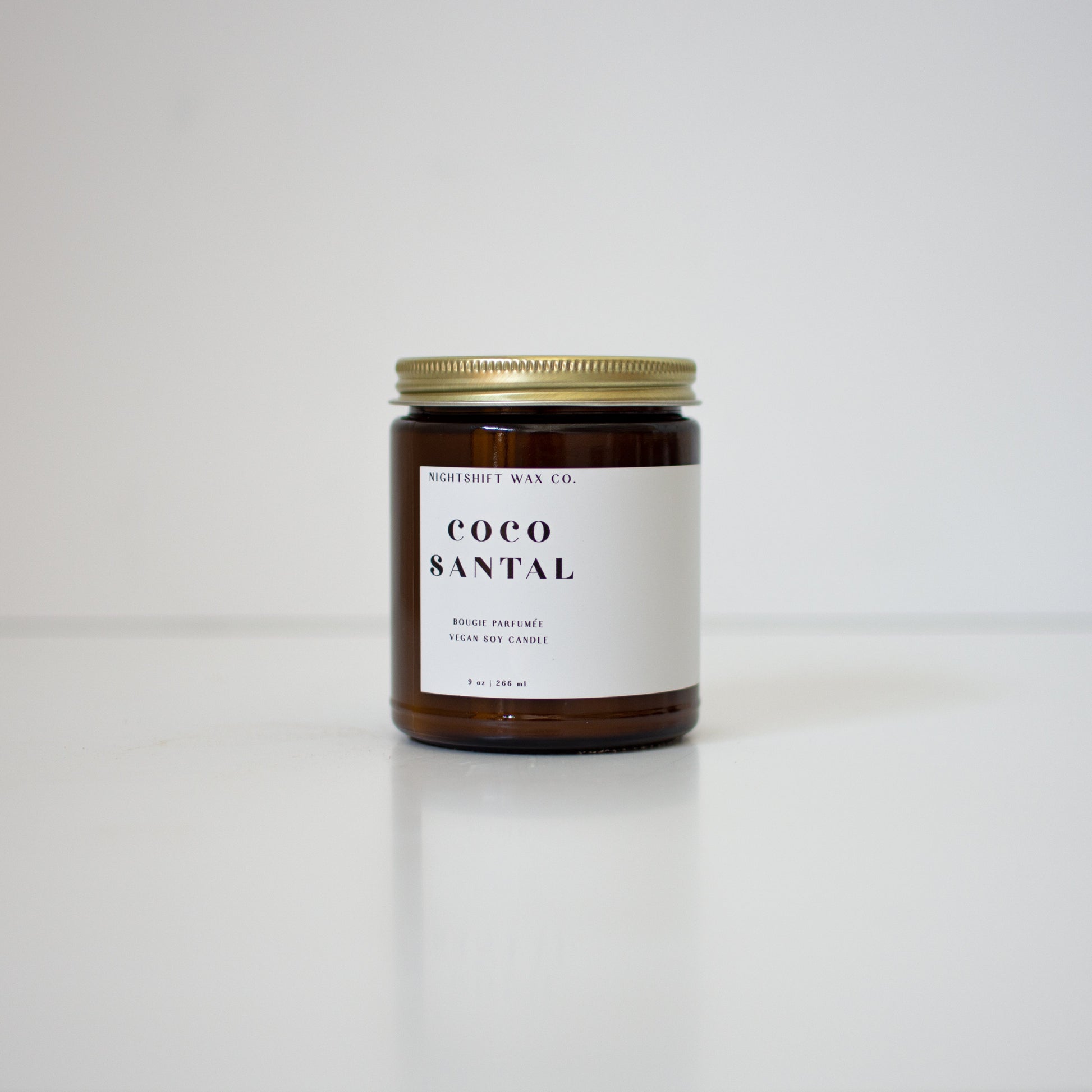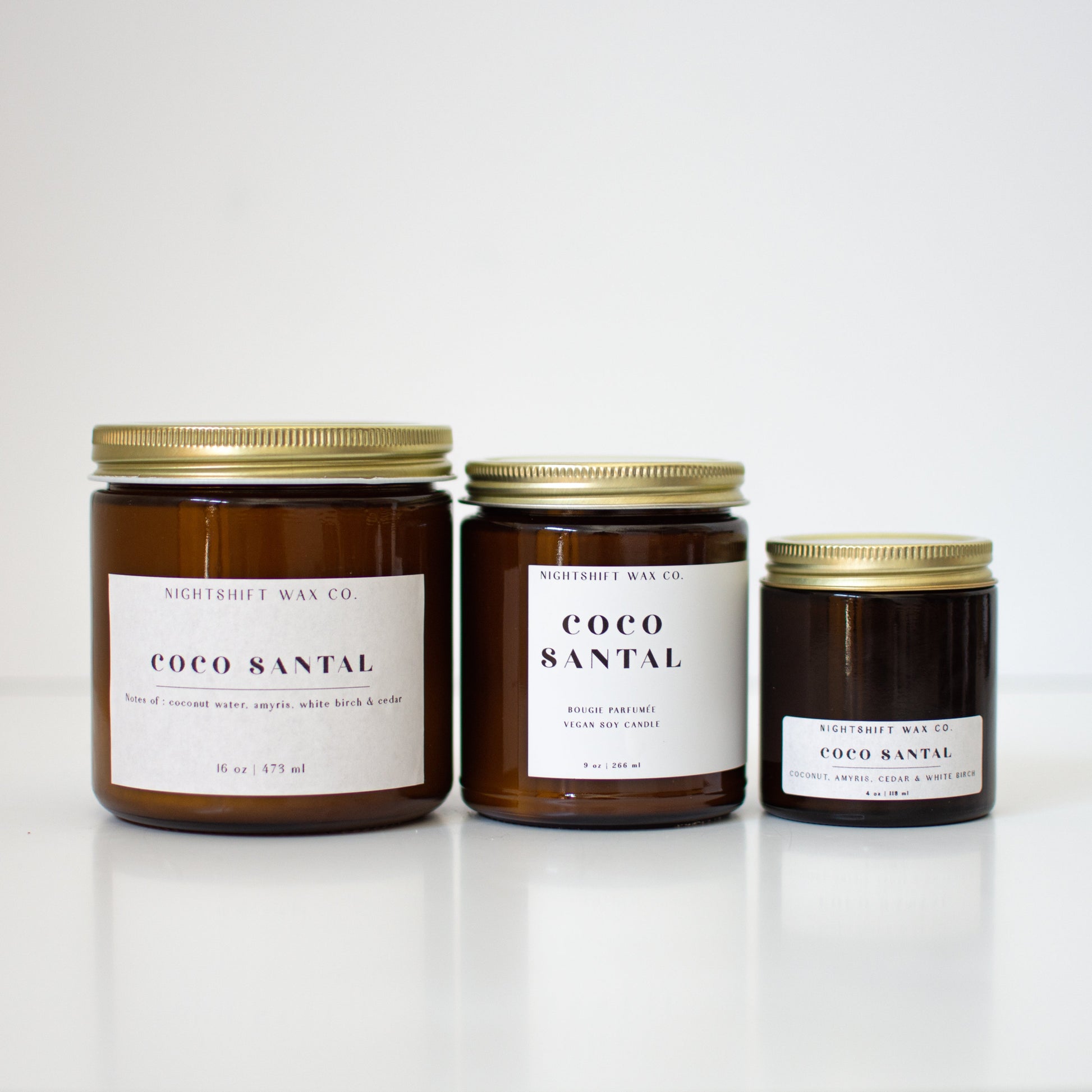 Candles are packaged in amber or clear glass reusable jars with gold metal lids.