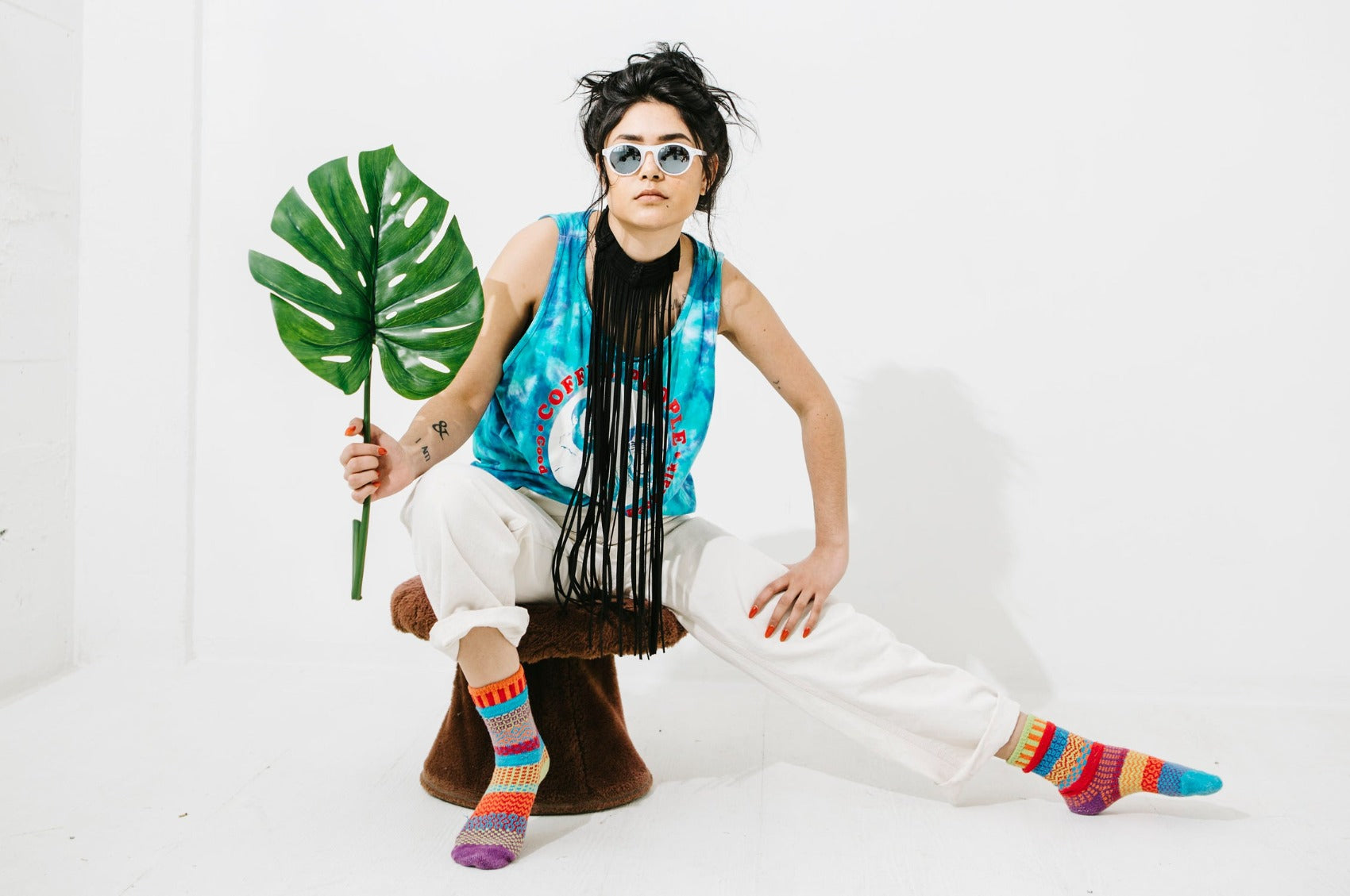 Like a cone of berry-flavored sherbet on a hot day, these socks will put a big smile on anyone's face. Made in the USA from recycled materials, this rainbow palette of beautiful colors is the perfect addition to any sock drawer. Colors in this sock: purple, lime green, red, orange, turquoise.