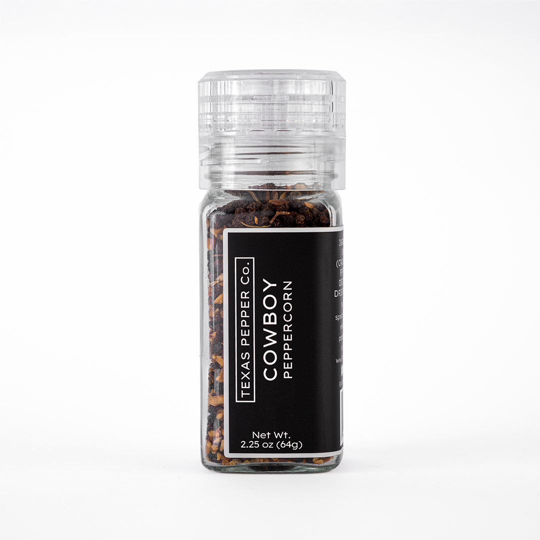 Smoke up your next meal with Cowboy Peppercorn! Our all-natural blend pepper is made with cracked black peppercorn, dried garlic, and dried rosemary for an intense, smoky flavor. Includes a convenient grinder for a perfect finish every time. Give your taste buds something to talk about!