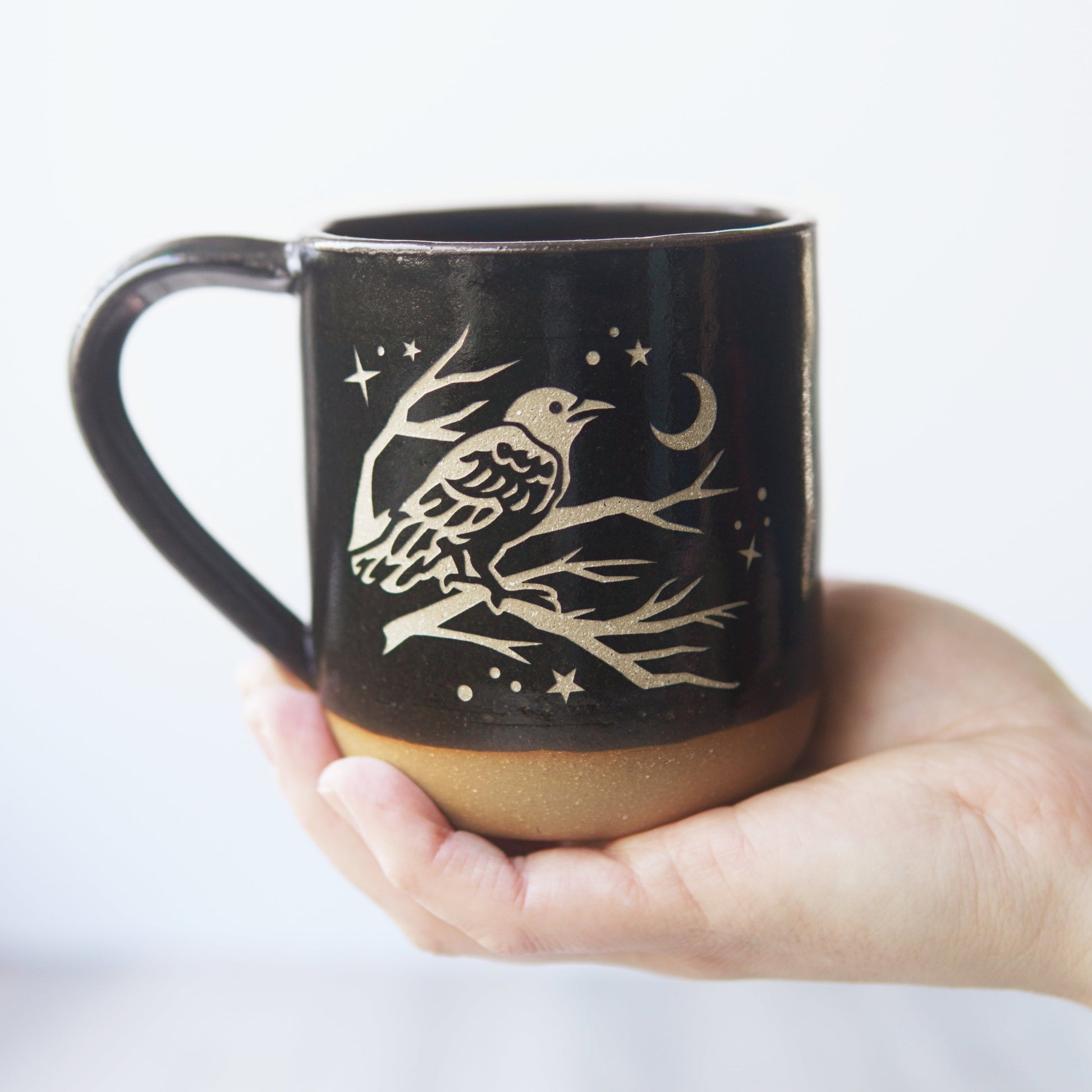 Treat yourself to a caw-ffee in our farmhouse style Crow Mug! This handmade ceramic pottery mug is more than just a vessel for your favorite brew - it's also a powerful symbol of death and rebirth. Perfect for dark-roasted coffee or moonlit tea, this mystical mug will add some extra charm to your daily rituals.