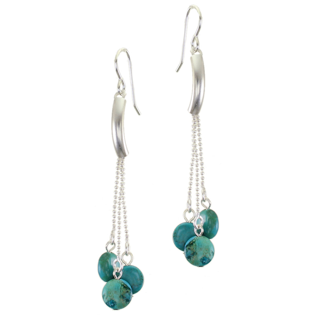 A curved silver tube with three strands of silver ball chain with turquoise disc beads hanging from them. A modern yet fun turquoise and silver earring with great movement.