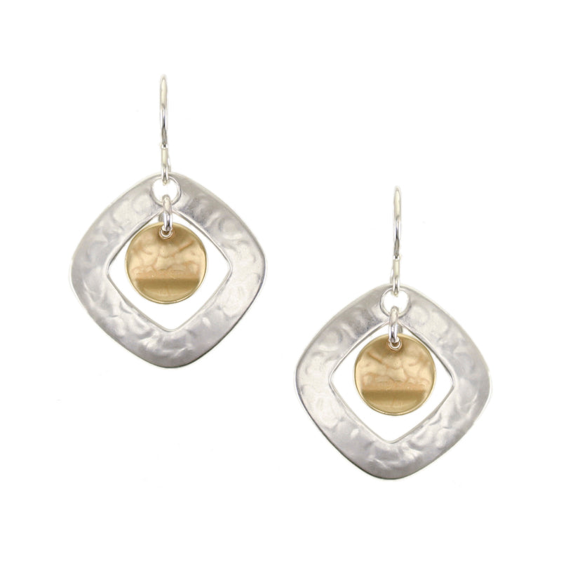 A silver cutout diamond shape with a brass hammered disc hanging in the center. A great go-to wire earring with subtle movement.