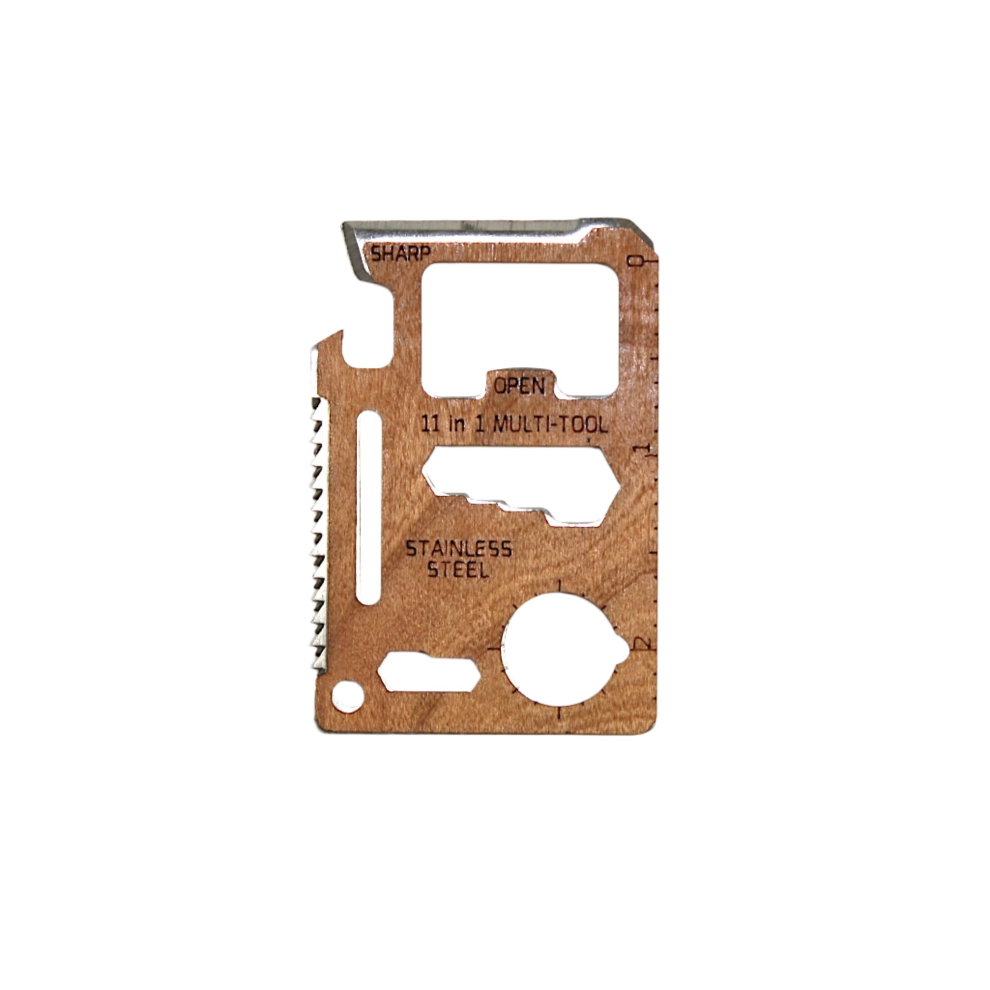 Built from 420 stainless-steel and covered in sustainable wood. Will not bend, break or rust. Smaller than a credit-card, fits in a wallet, purse, toolbox or glove-box.