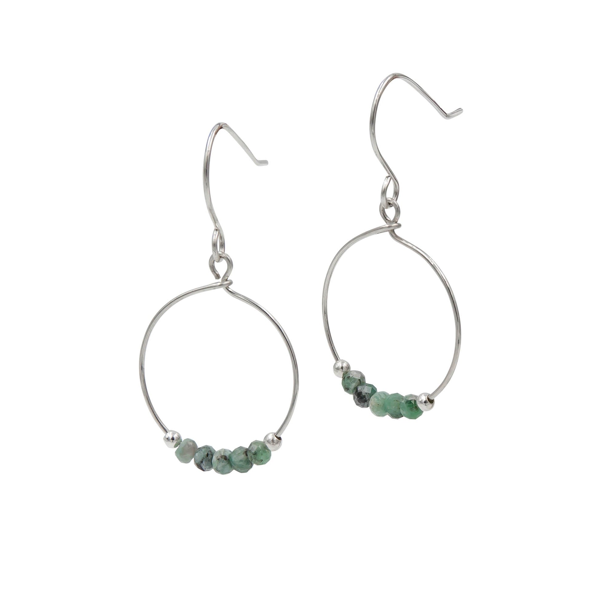 Wear a pair of these hoops for your everyday fashion. With faceted sparkling raw emeralds, accented with Sterling Silver beads on dangling hoops, these are a versatile modern style that will match any look.