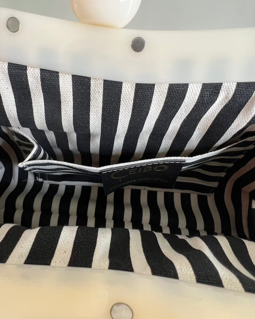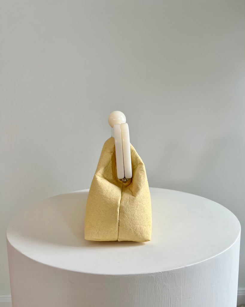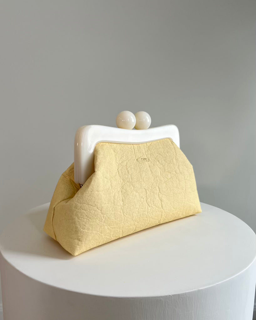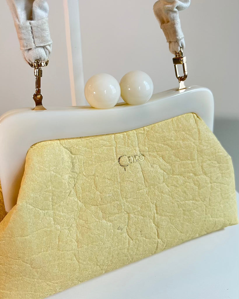 - Materials: Body: Piñatex, an innovative textile made from pineapple leaf fiber. Strap: Hemp and Organic Cotton fabric. Canvas lining. Magnetic snap clasp Acrylic frame. Gold toned hardware. Removable shoulder strap.