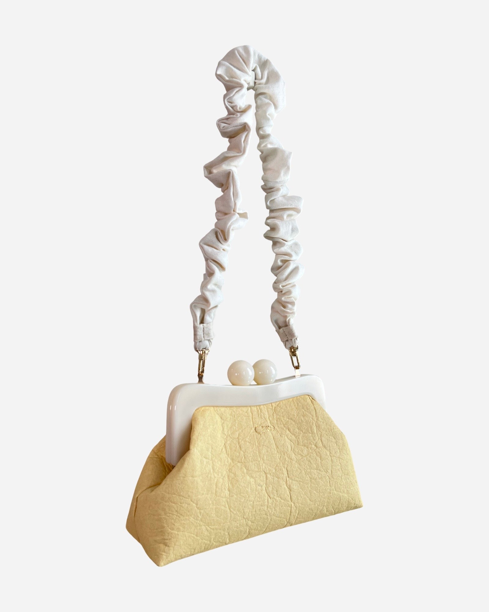 Frame purse to hold all of your daily essentials. Detachable scrunchie shoulder strap.