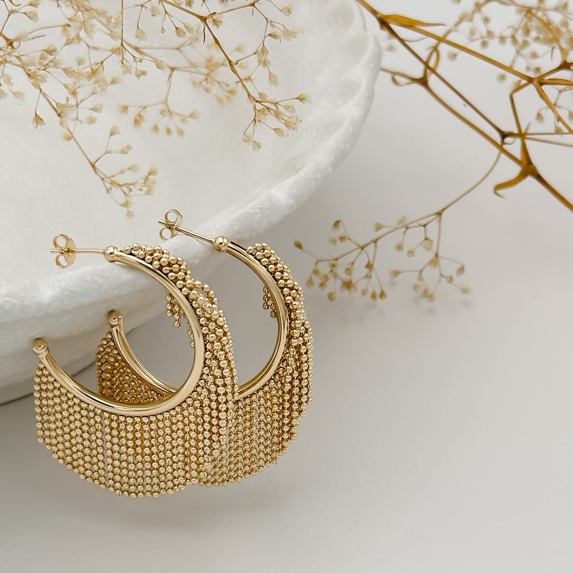 Fergalicious… Nothing screams early 2000s glam more than our Fergie Beaded Hoop Earrings. These classic 18k gold-filled hoops adorned with hundreds of minuscule gold beads will prompt you to grab your vintage low rise hip-hugger jeans, or Juicy tracksuit, lace-up Manolos and hit a night out on the town with the girls. Make our Jonesy Wood Fergie Beaded Hoop Earrings yours today…they are so delicious.