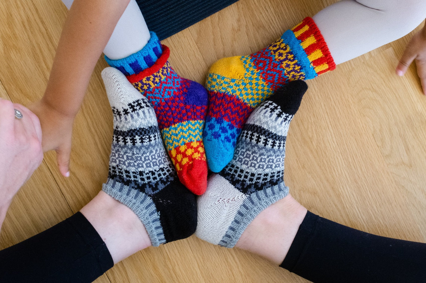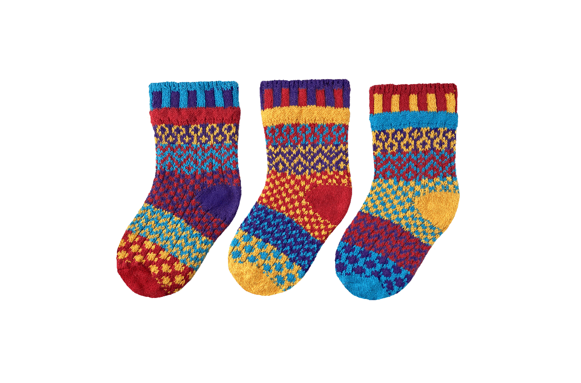 Our Kids Socks come in sets of 3: A pair + 1 spare! Whimsically mismatched with recycled materials and made in the USA, our kids socks are the perfect pop of color for precious little toes. Colors in this sock: purple, yellow, cherry red, turquoise.