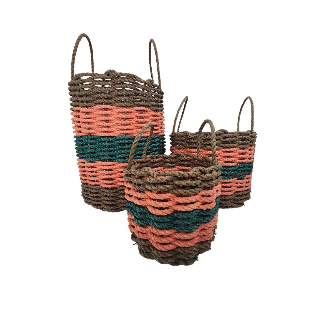 This is a colorful handmade basket, woven with the very same rope that fishermen use to tend their gear here on the coast of Maine. Lobster rope is extremely durable, lasting against strong tides and storms at sea, while the colors are vibrant and long lasting as well.