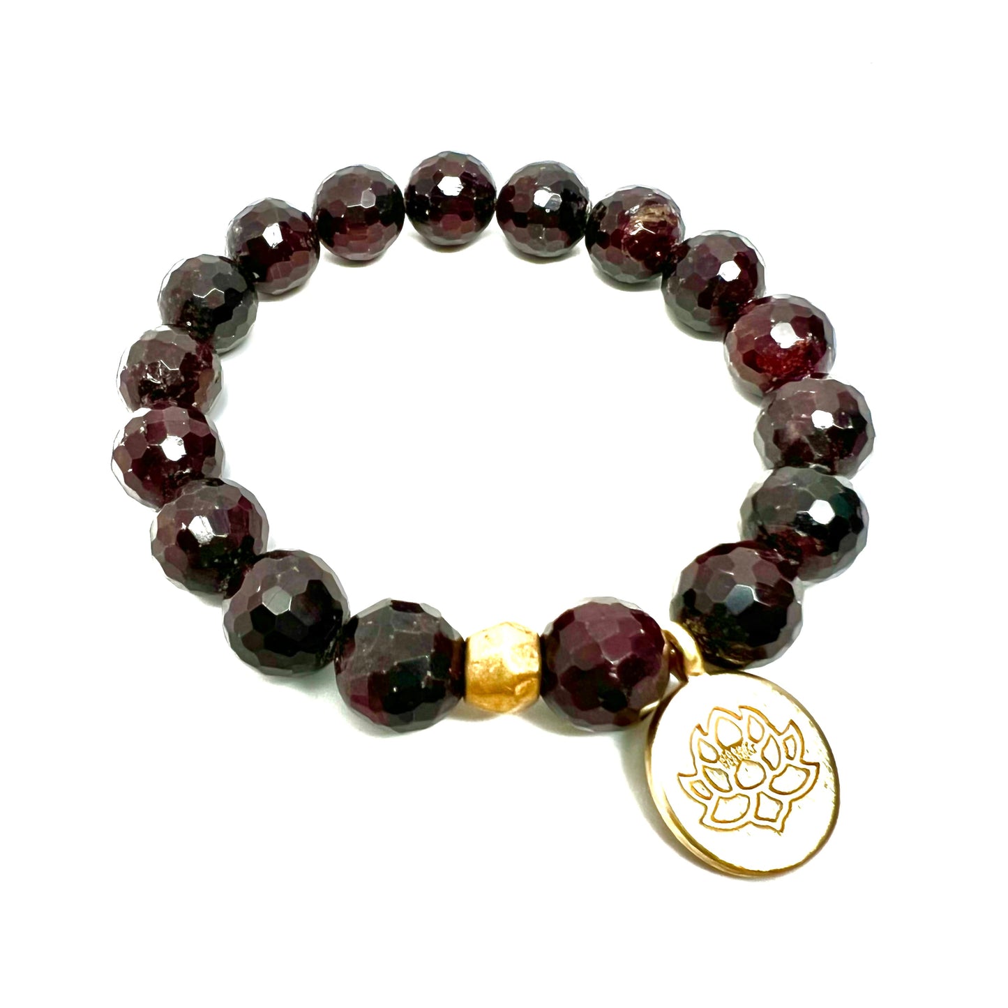 10mm faceted cut Garnet semiprecious gemstone stretch bracelet with gold tone pendant of your choosing.