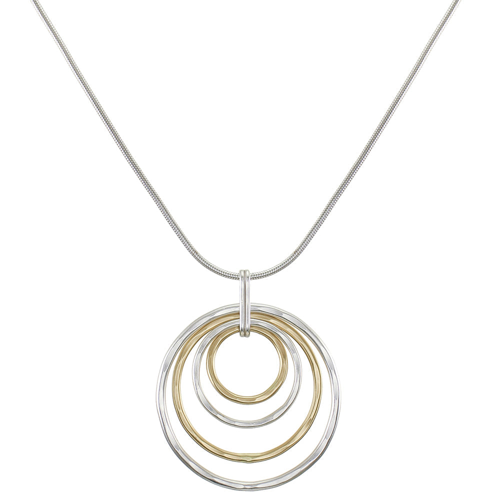 Four hammered and tiered rings in brass and silver - hung with a flat ring on a thin round snake chain. A light yet substantial necklace with beautiful sculptural texture.