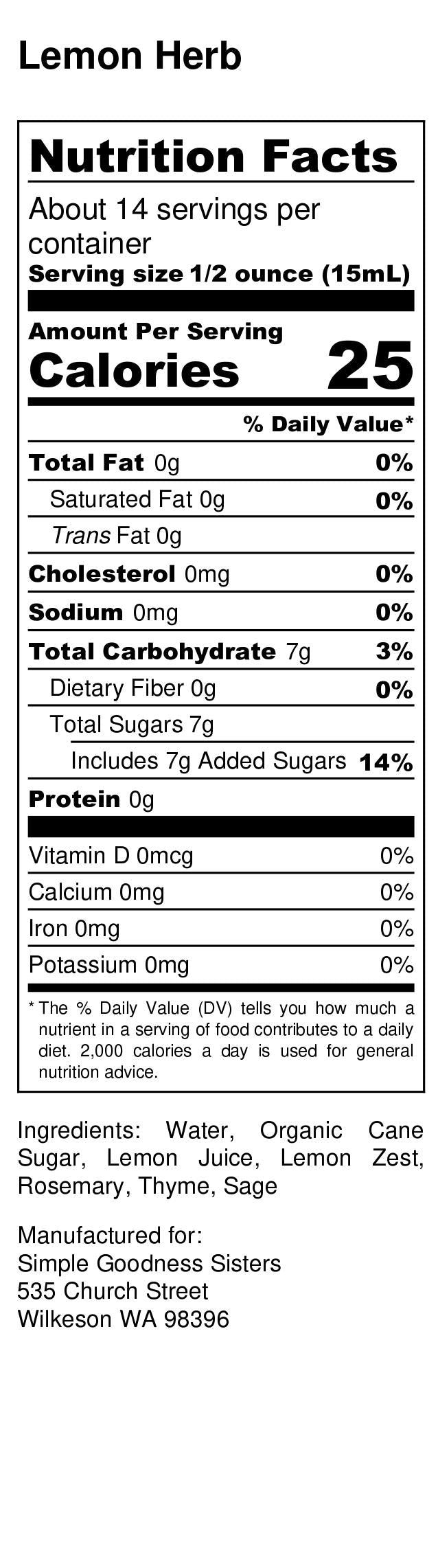 Fresh, botanical, and herbaceous, this herbal simple syrup has the cleanest ingredient list on the market. Think of it like the classic Provence savory spices in your cupboard- rosemary, sage, thyme, and lavender come together with the zing of lemon for a sophisticated syrup that creates a balanced cocktail or zero proof mocktail with minimal effort. We always begin with whole ingredients sourced from local farms, and this syrup includes pounds of fresh, aromatic herbs from the Simple Goodness Farm. These are the most intense and naturally flavored simple syrups on the market- for real.