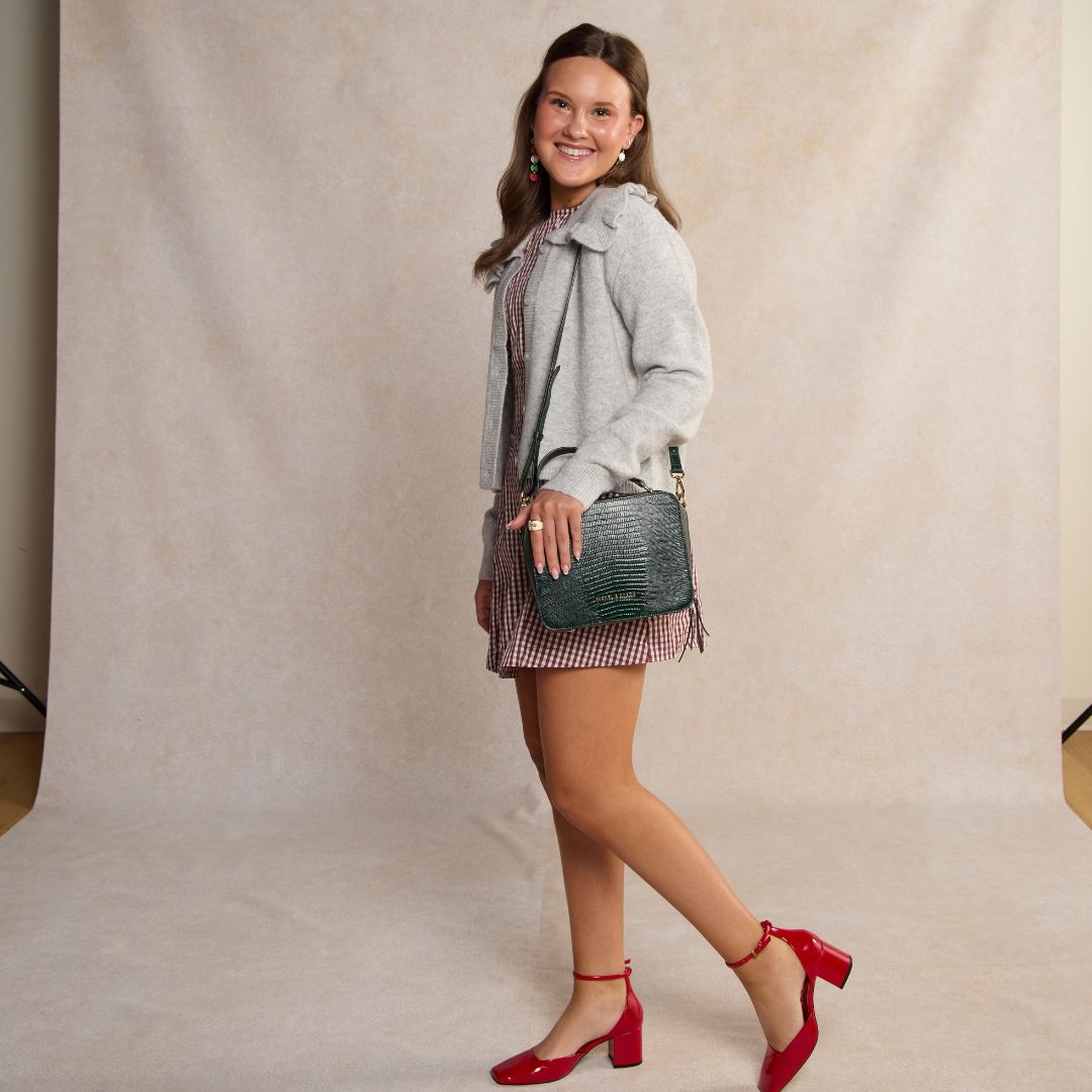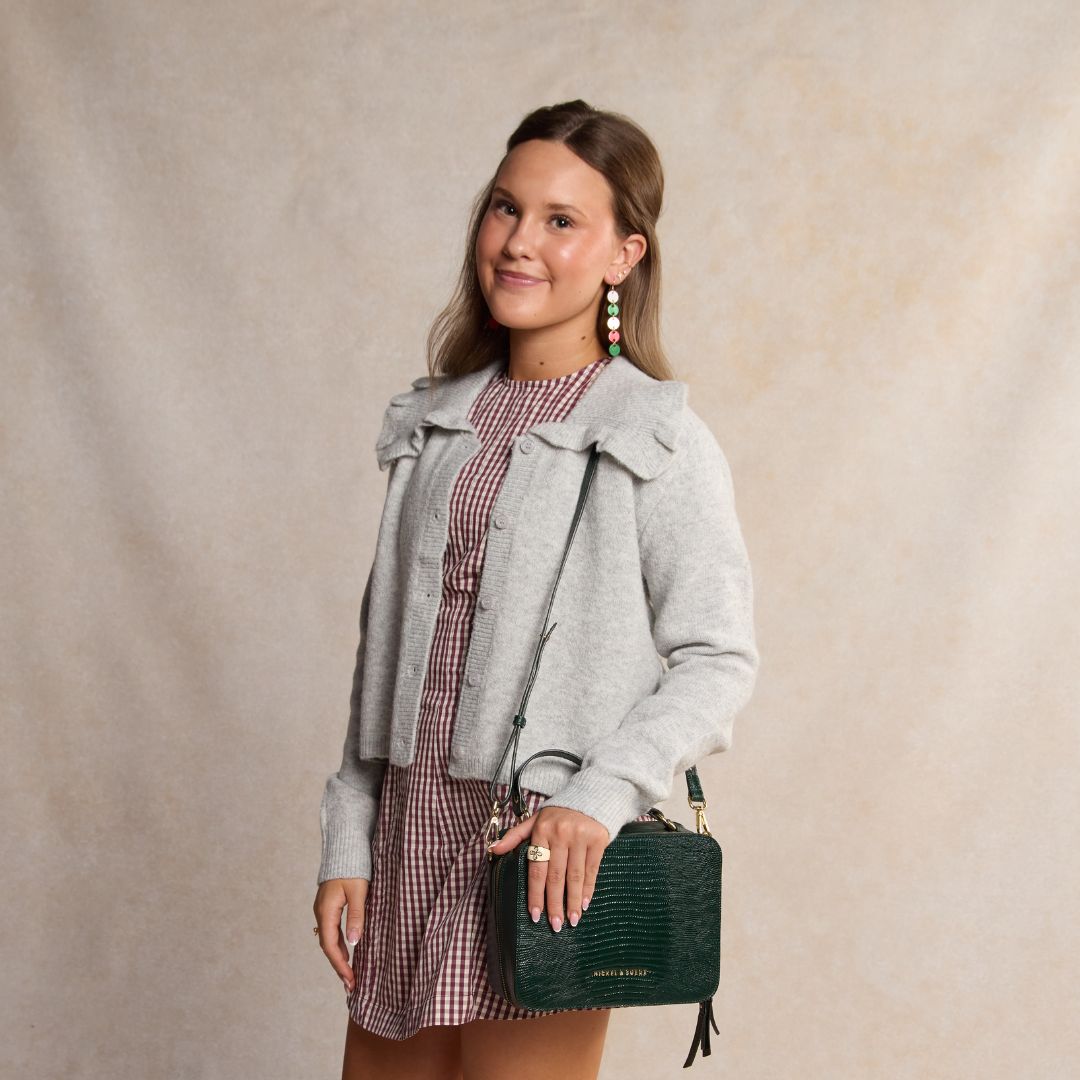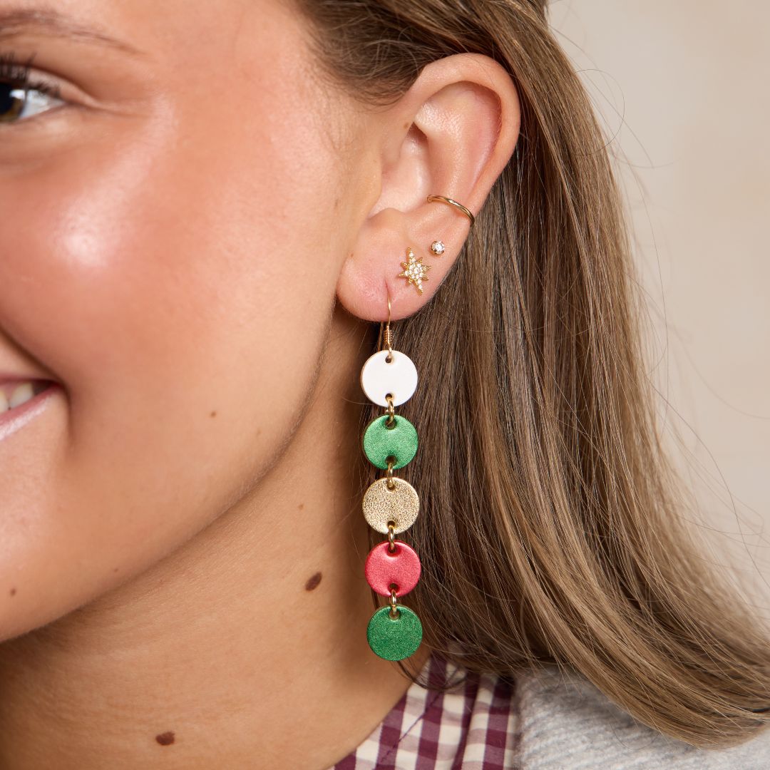 Made with a variety of our Gold Satin, Crimson Shimmer, White Sparkle and Emerald Sparkle leathers, the Confetti Sylvie is a statement earring. This lightweight earring has fun movement and color, allowing you to be unique and versatile with style.