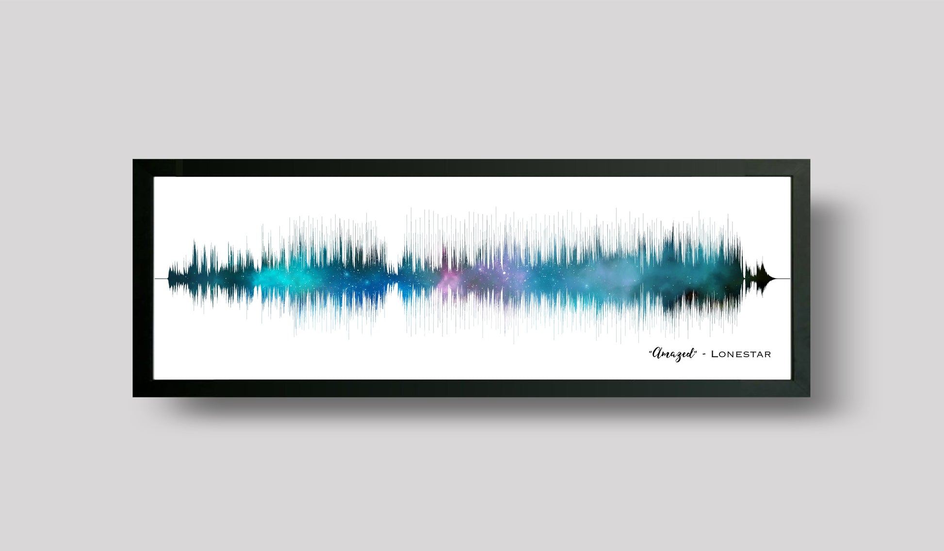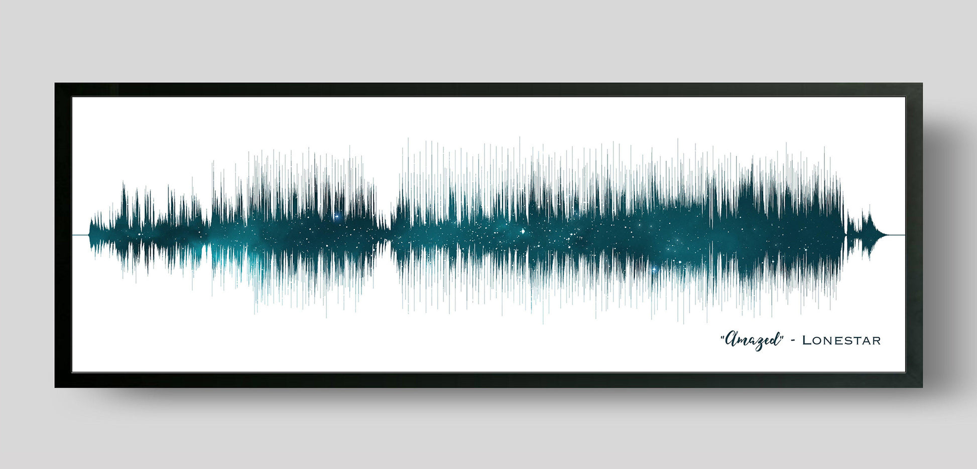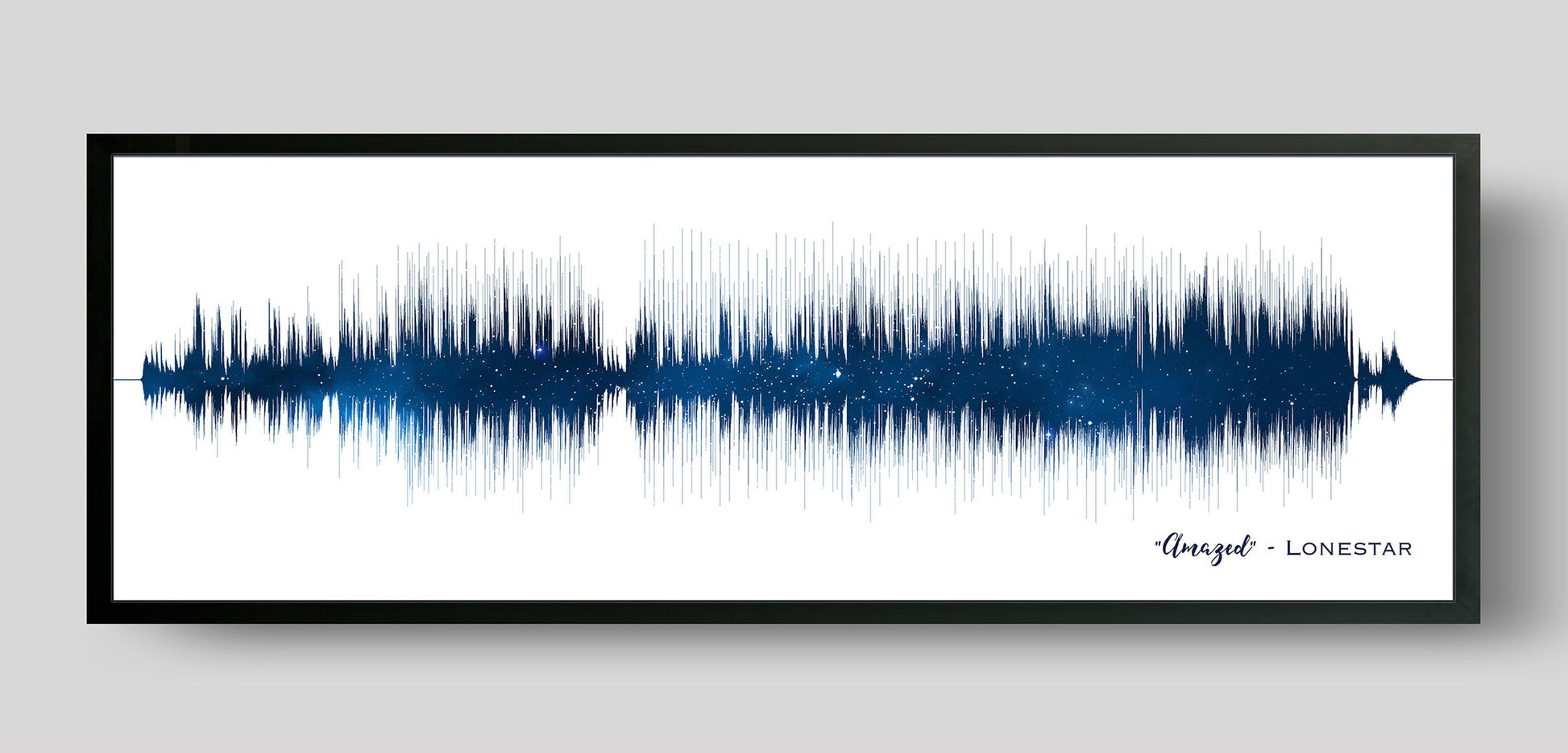 Customized with your choice of song or voice message. Choose from 8 starry night colors for your sound wave. A unique way to display your favorite music and a thoughtful gift for music lovers.