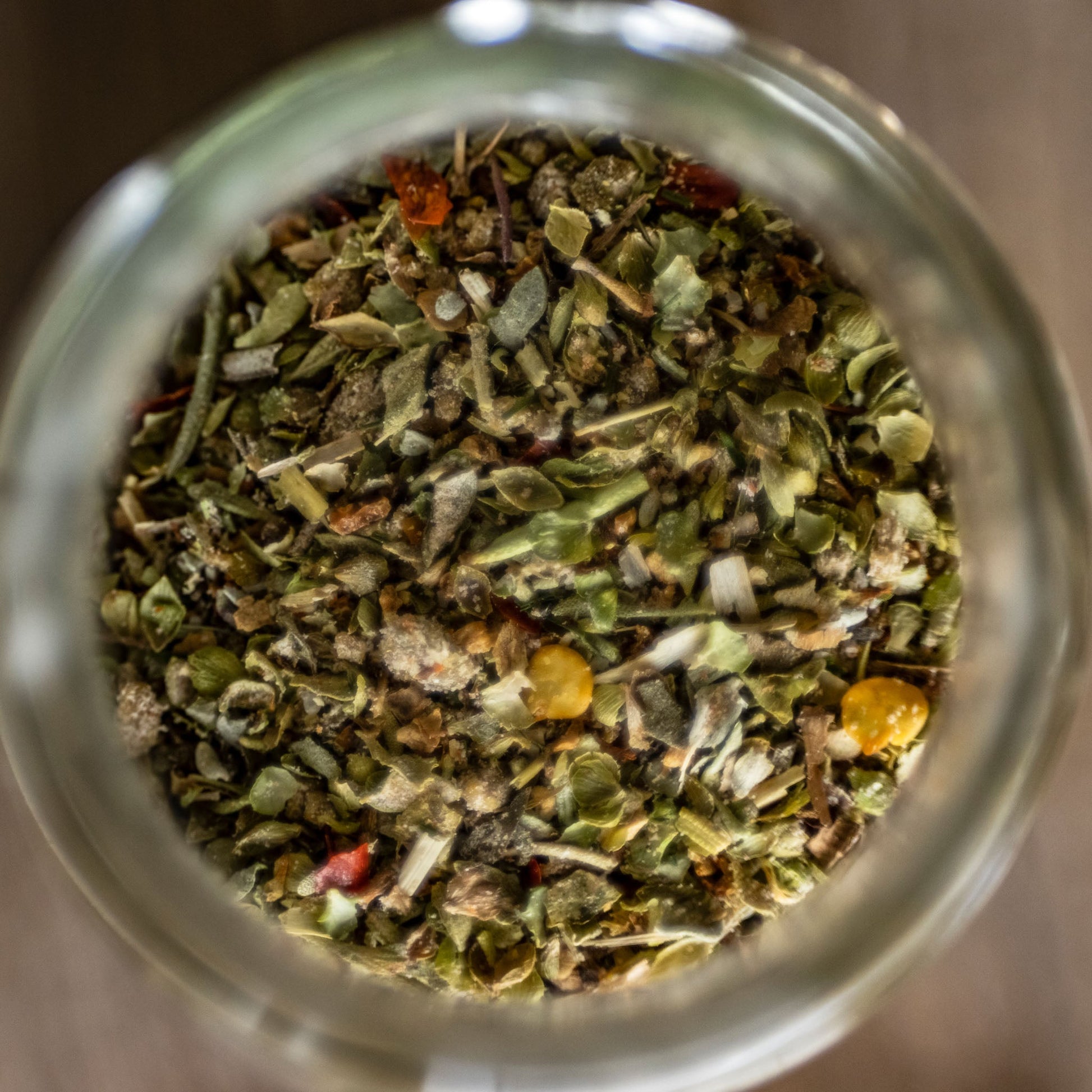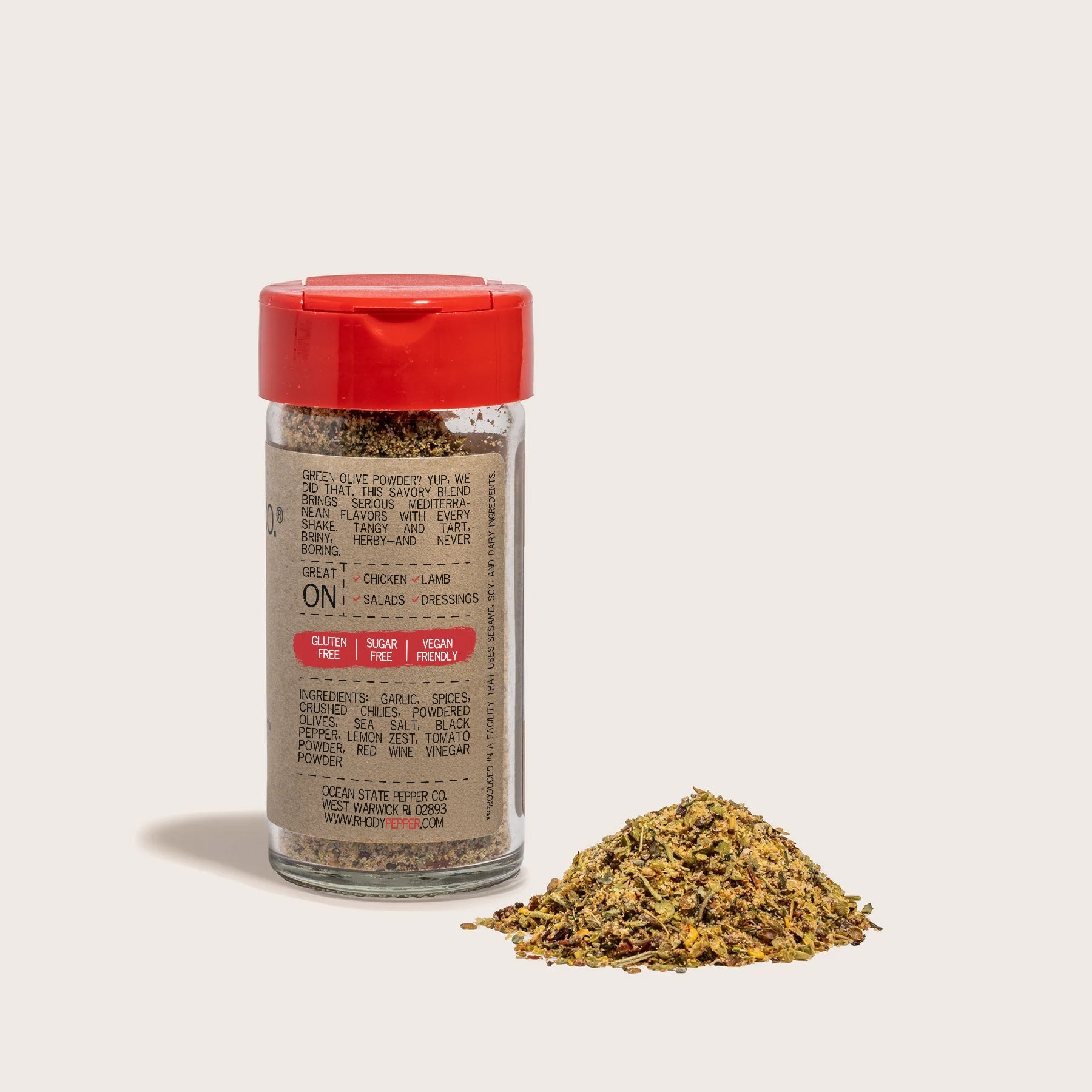 What happens when you create a green olive powder? Strap on your flavor seat belt, because you are in for a wild ride. We bring classic flavors of the Mediterranean to life with this savory blend of herbs, garlic, citrus, chilies, and of course...olives. Rounded off with red wine vinegar, this seasoning is an instant hit for everything from salads to seafood, and is also a perfect match for anything hitting the grill. So go ahead, make it rain over your next meal and see what all the fuss is about.