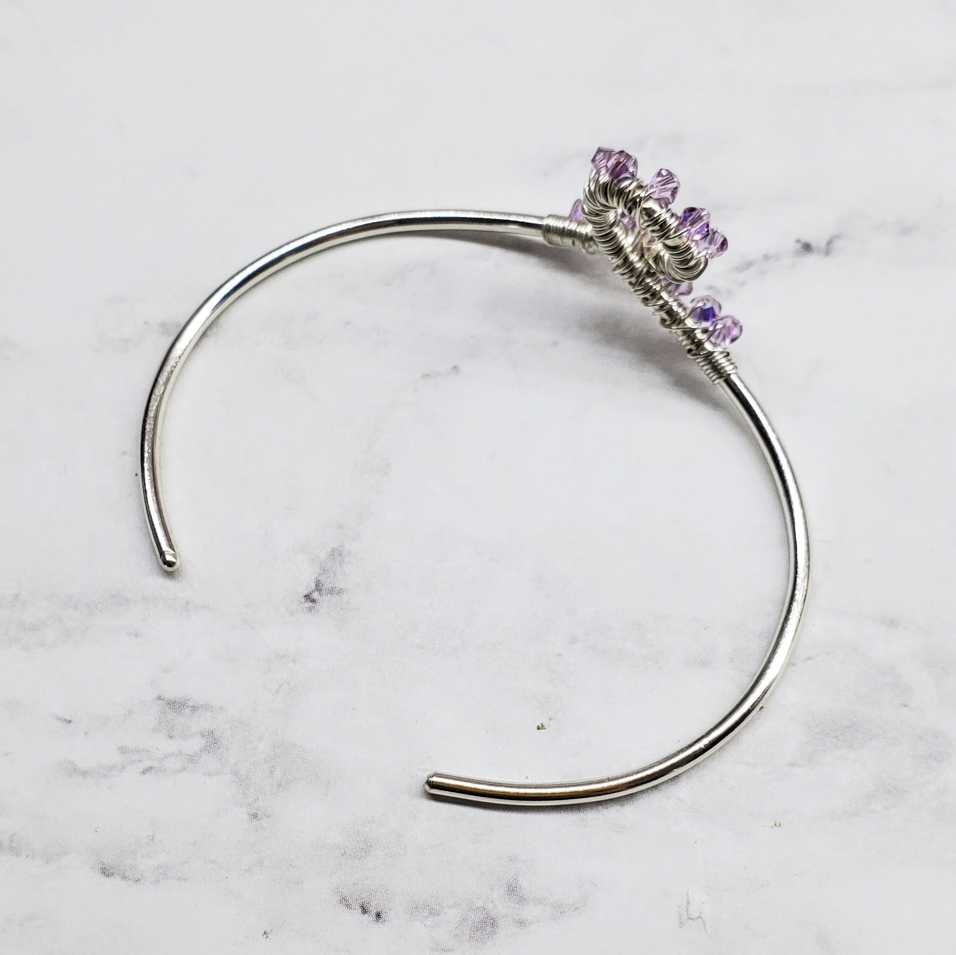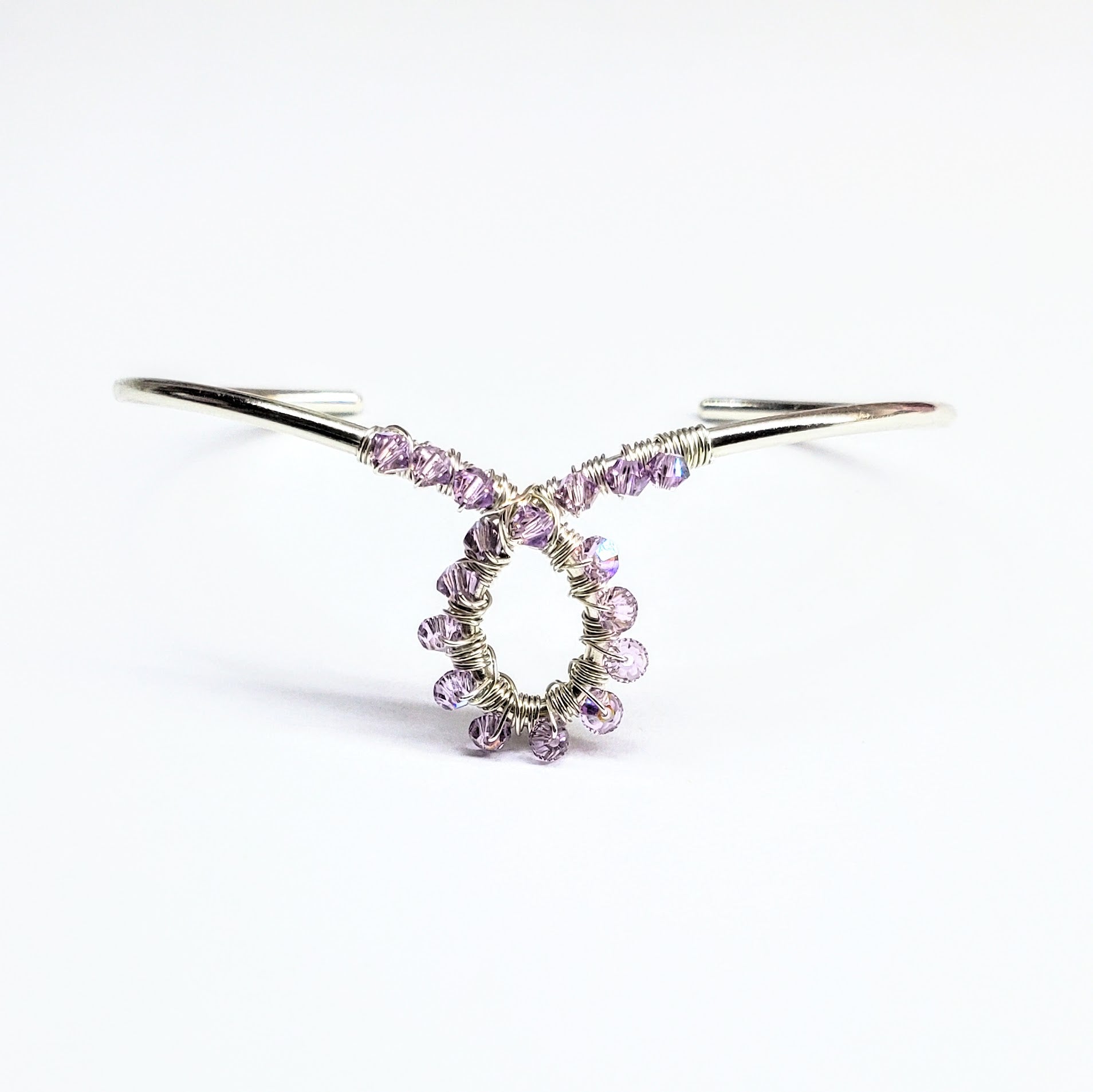 First, I carefully select a piece of 12-gauge silver wire and transform it by hand into a stunning, ergonomic, ribbon-shaped bangle cuff. Next, I beautifully wire-wrap glimmering lavender Swarovski crystals onto the loop of the bangle using 2 yards of luxurious sterling silver wire, accentuating the elegant curve of the ribbon. This exclusive cuff symbolizes hope and support uniquely. Wear it proudly while championing a cause that resonates with your heart and the hearts of your loved ones. It's designed not to turn and to sit snugly and comfortably on your wrist!