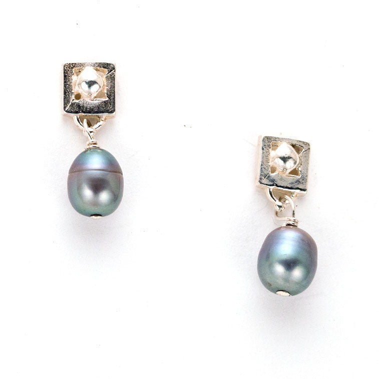 These fun little earrings, available with pearl or stone drops, strike a perfect balance between organic and architectural design elements. Freshwater pearls or semi-precious stones, untamed and unique, dangle playfully from the organized structure of the framed dots.