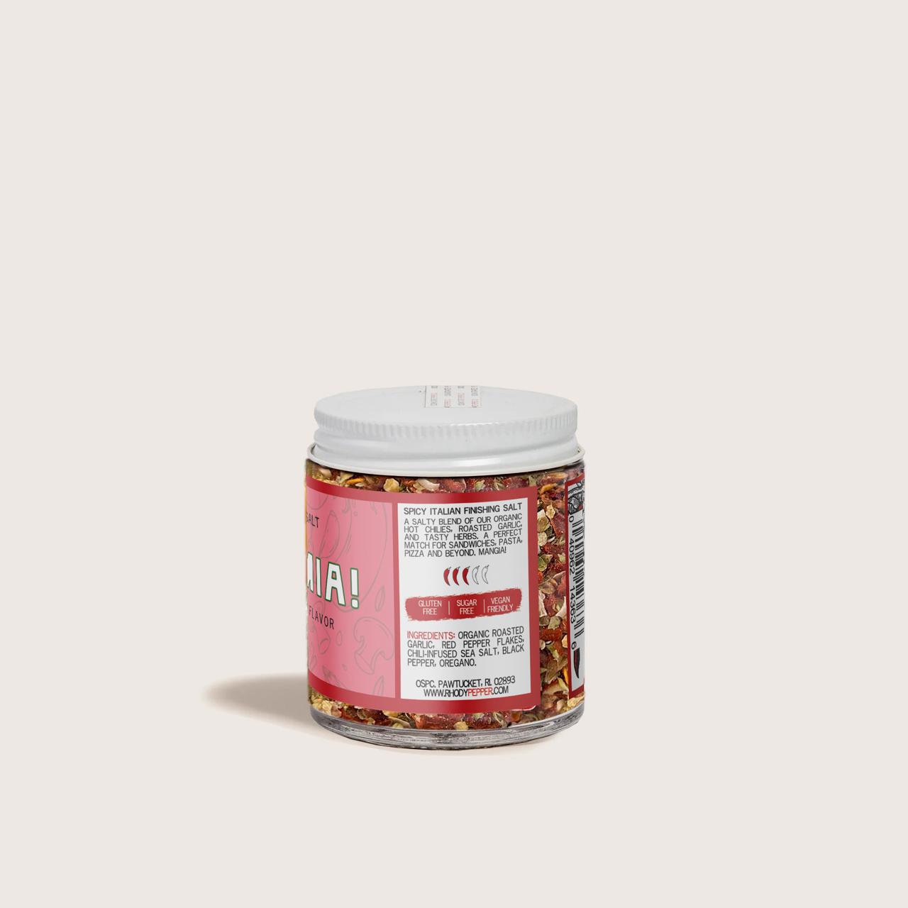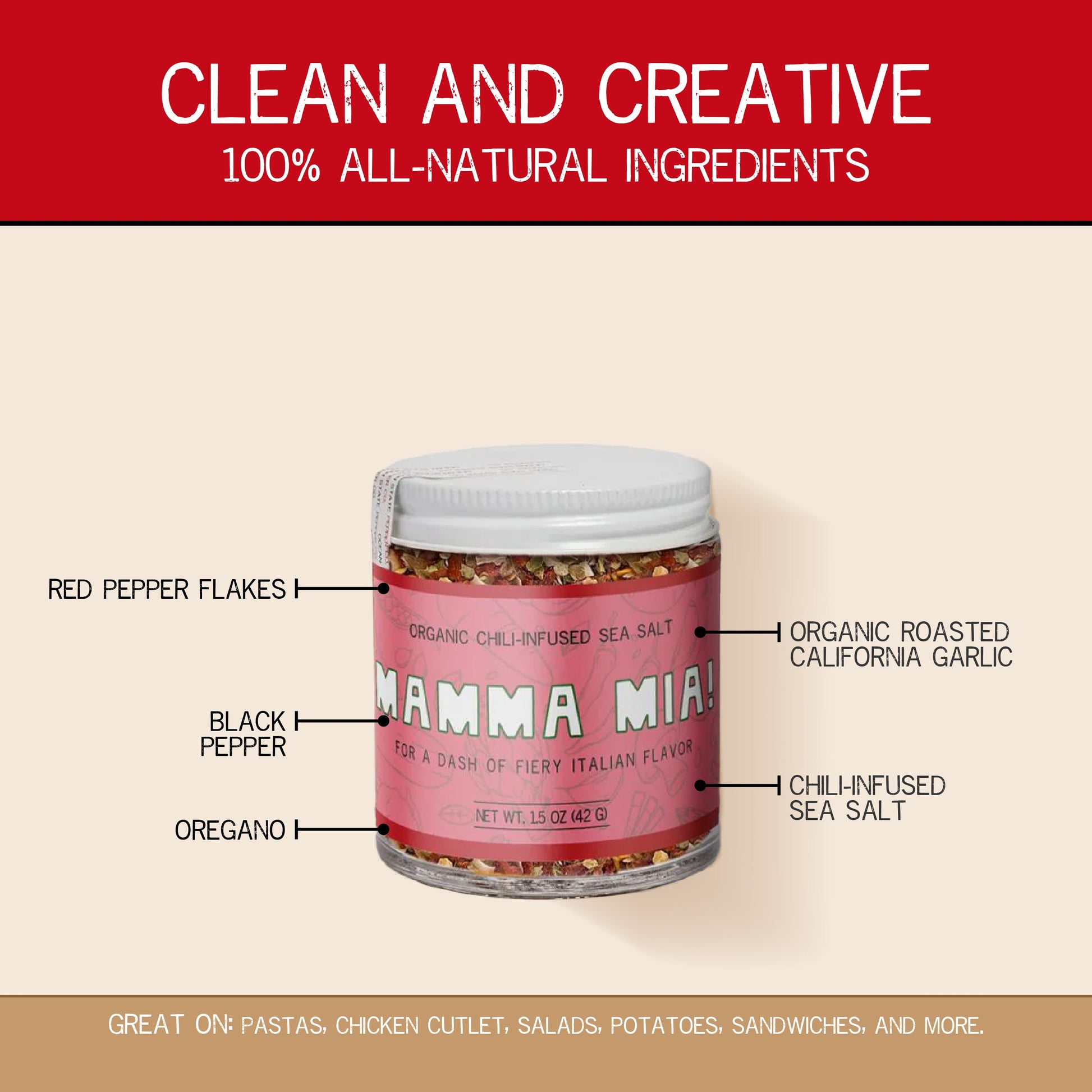 Spicy, savory, and straight outta the boot. Mamma Mia is our fiery Italian-inspired finishing salt that brings the heat and flavor of Sicily right to your plate. We start with all-natural sea salt infused with organic hot chilies, then blend in Cali-grown roasted garlic, tasty herbs, and black pepper for a bold, balanced kick that’s as versatile as it is addictive.