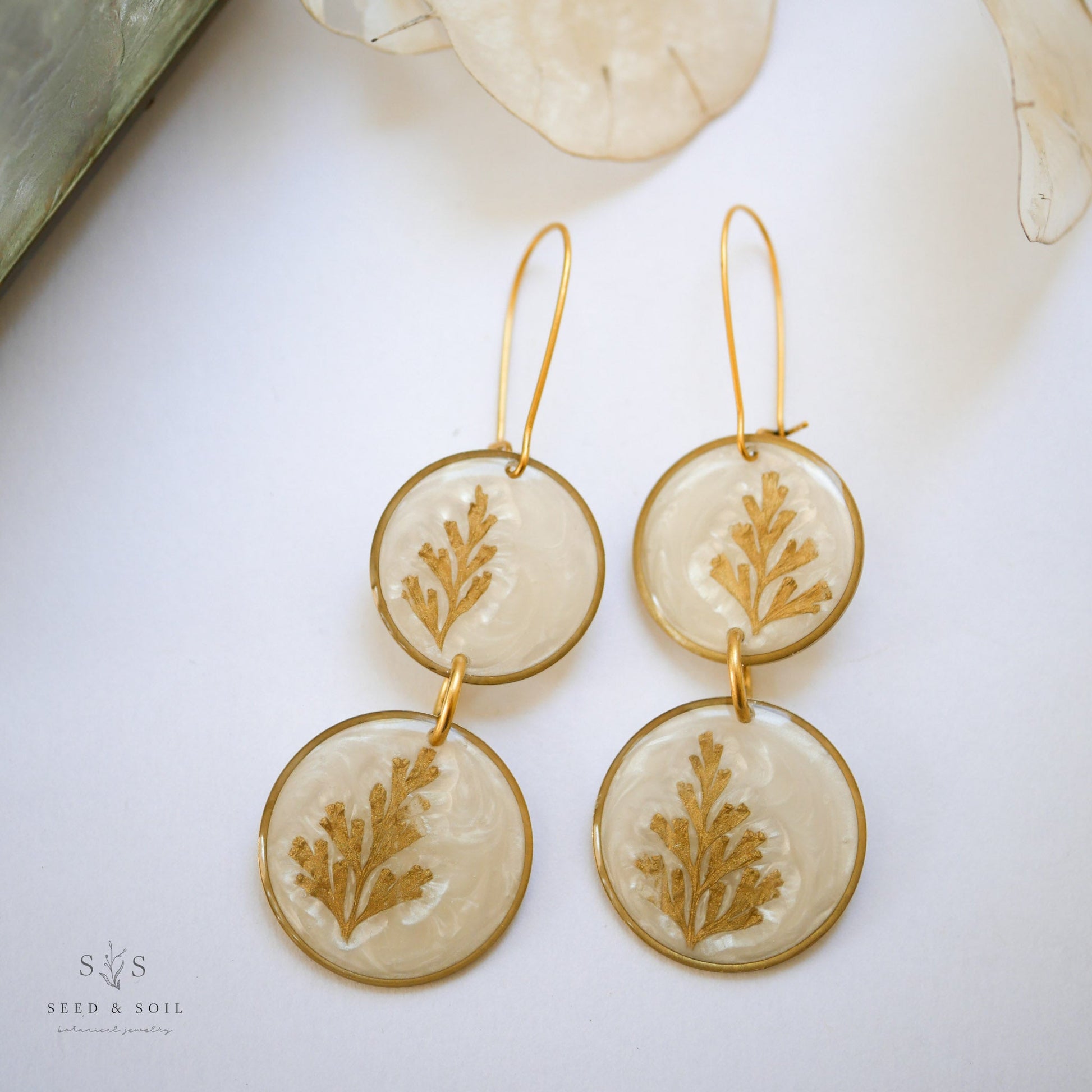 These earrings blend modern shapes with the vintage/elegant combo of pearly opalescent/gold and they are super lightweight so you can wear them all day without a second thought. Each round frame contains a real gilded golden fern.