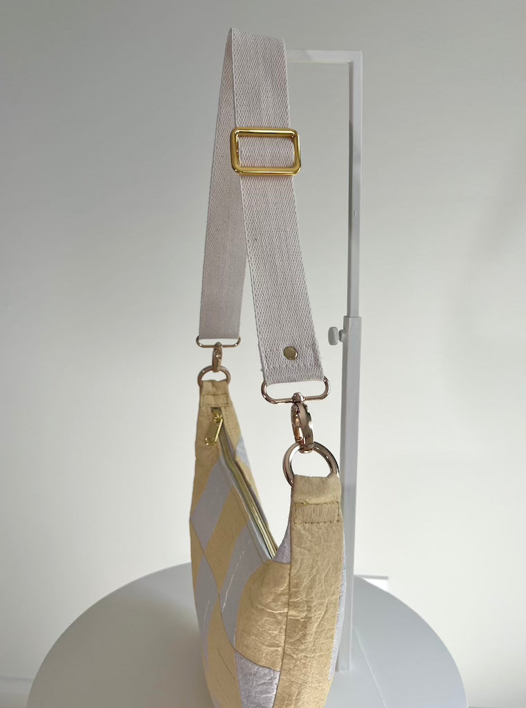 Checkered patchwork design. Adjustable cotton strap. Zipper closure. One interior zipper pocket and one interior slip pocket.