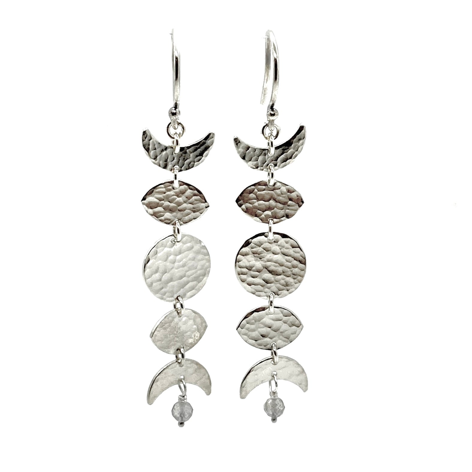 These earrings are made with hammered sterling silver and have sterling silver earwires. They are lightweight and comfortable to wear, making them perfect for everyday or special occasions. The intricate details of each phase of the moon are individually hammered by hand, giving these earrings a unique and stunning look.