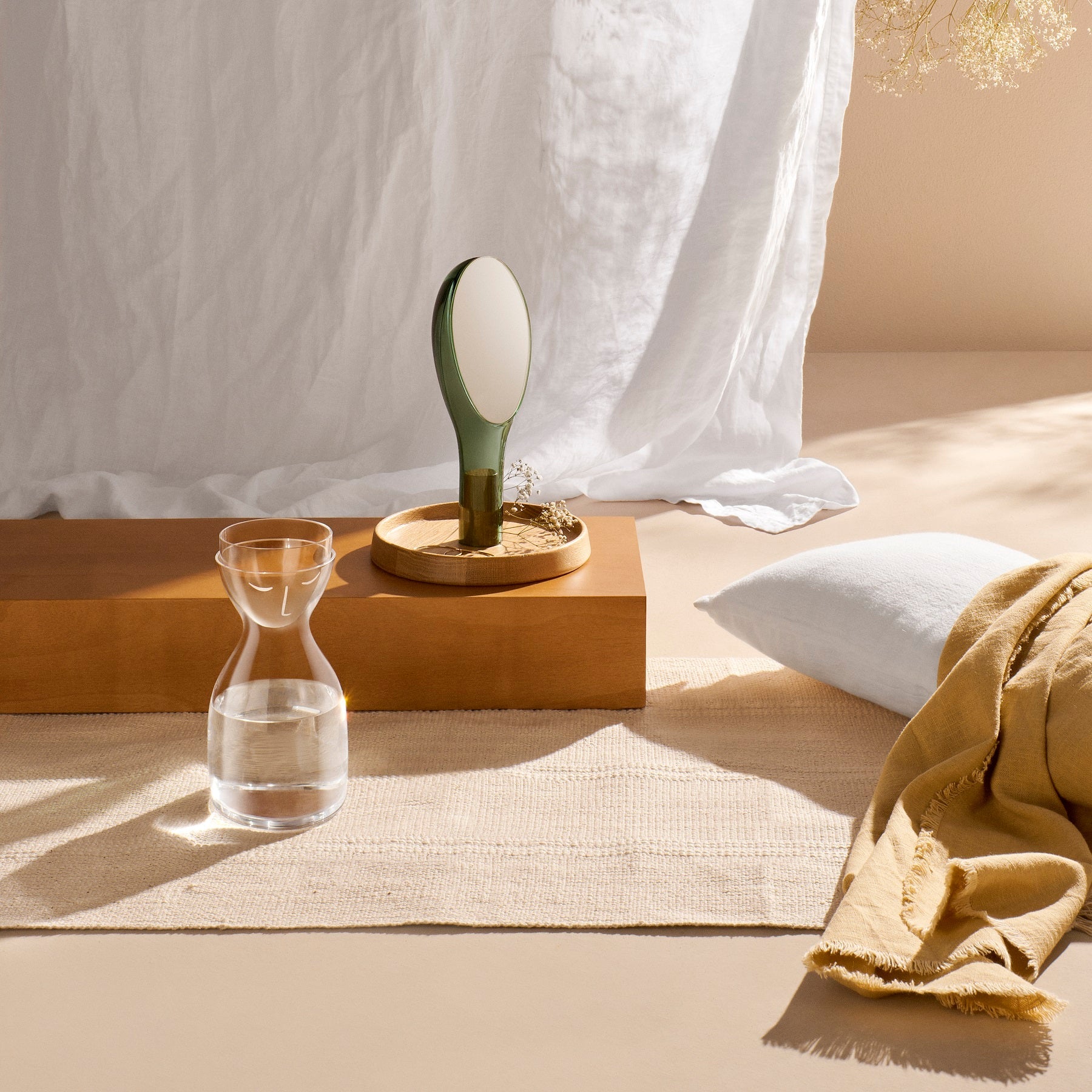 This NUDE Mr.&Mrs. bedside water set is conspicuous in its simplicity. Crafted from mouth-blown crystalline glass, the short silhouette has a considered yet playful quality, thanks to the sleeping face motif adorning its matching cup, which also doubles up as a bottle stopper.