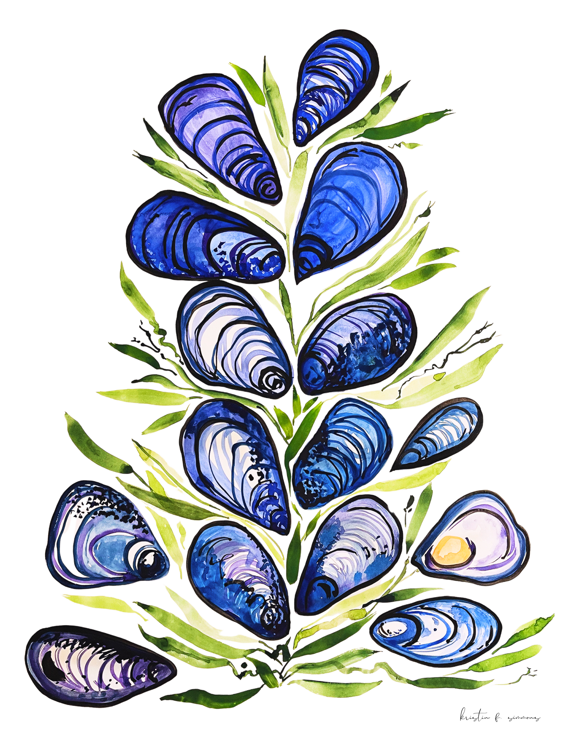 Fine Art Giclée Print of The Mussel Tree~ Inspired by the Mussel Farms in Casco Bay off of Portland, Maine. The original hangs in the headquarters of Bangs Island Mussels and was crafted with Japanese Kuretake Gansai Tambi Watercolor on Cold Press 100% Cotton Paper. Your print will be on 100% cotton paper with archival inks.