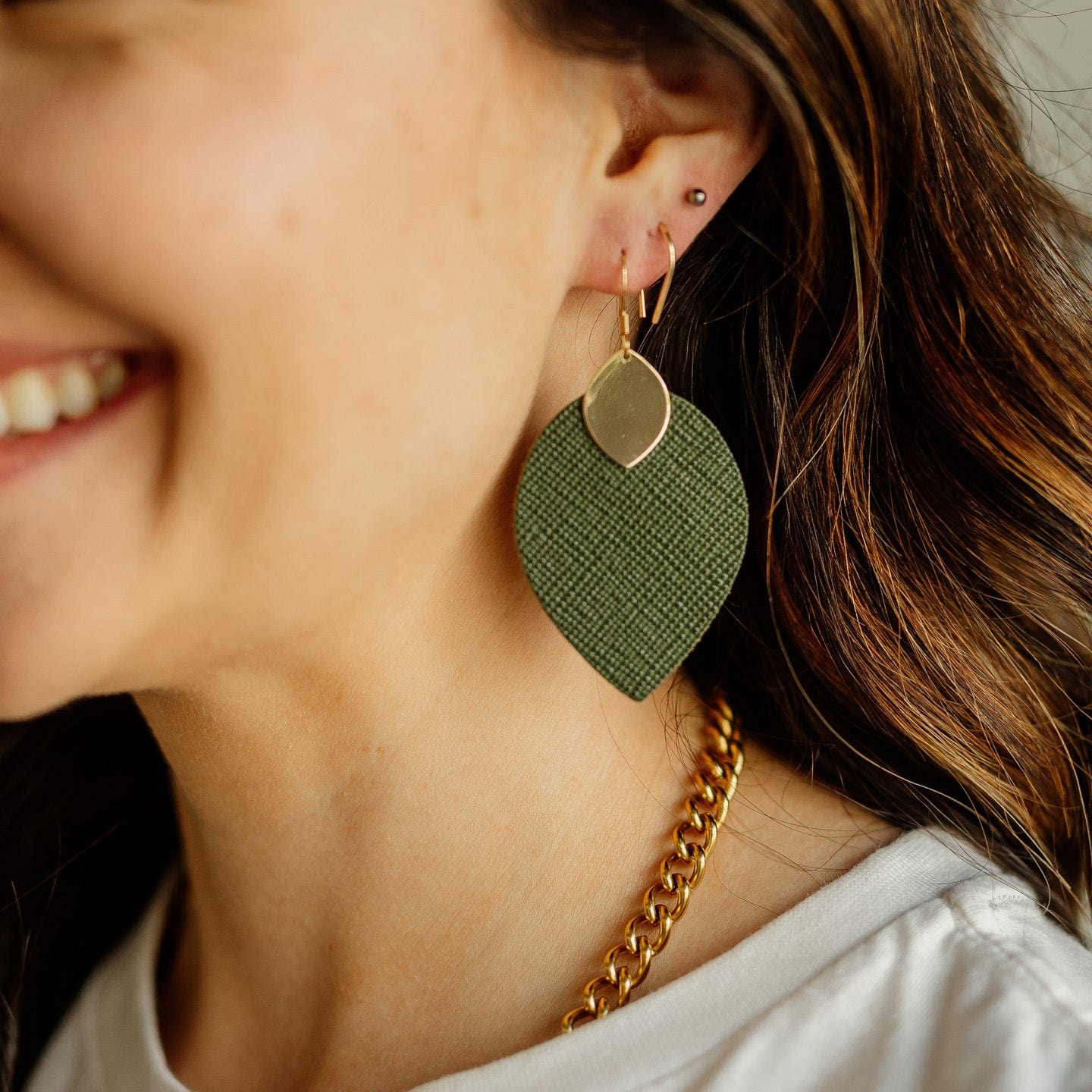 Lightweight earrings made with textured olive green leather. The Cora Earrings are a conversation starter, not only due to their beauty but to the story they tell.