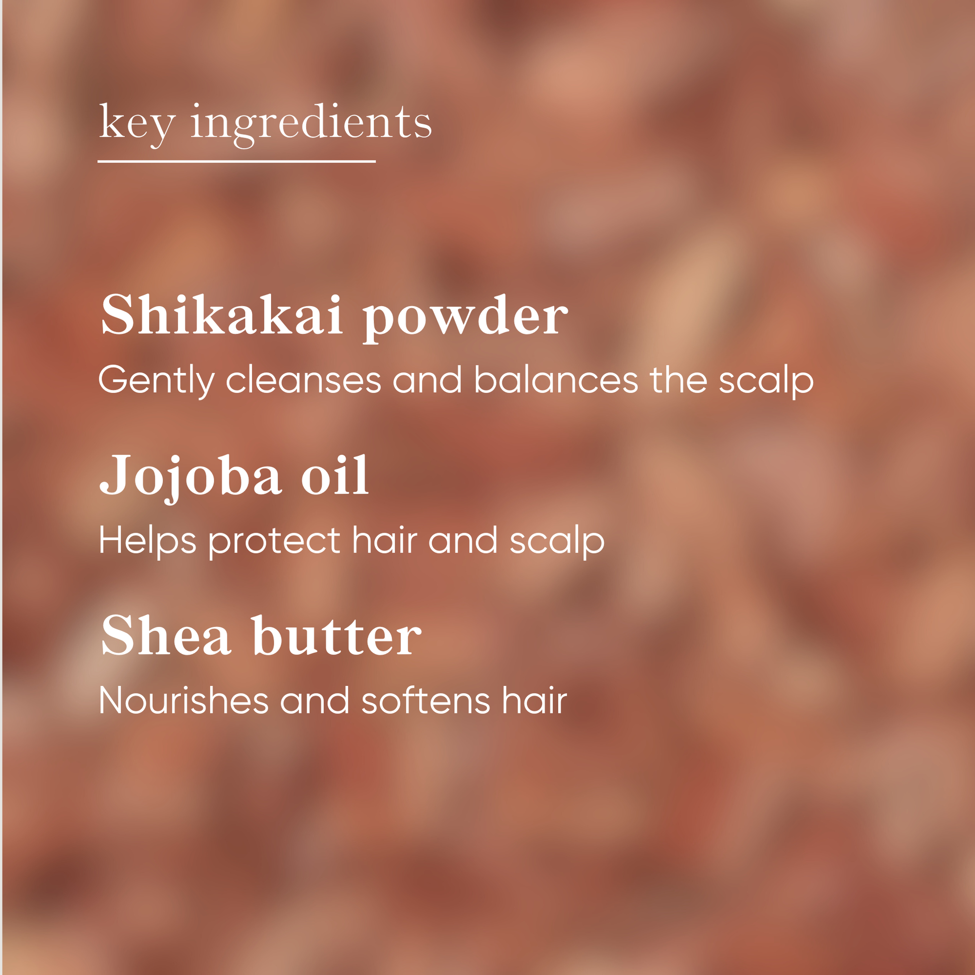- Shikakai powder — gently cleanses, calms the scalp, and adds natural volume.