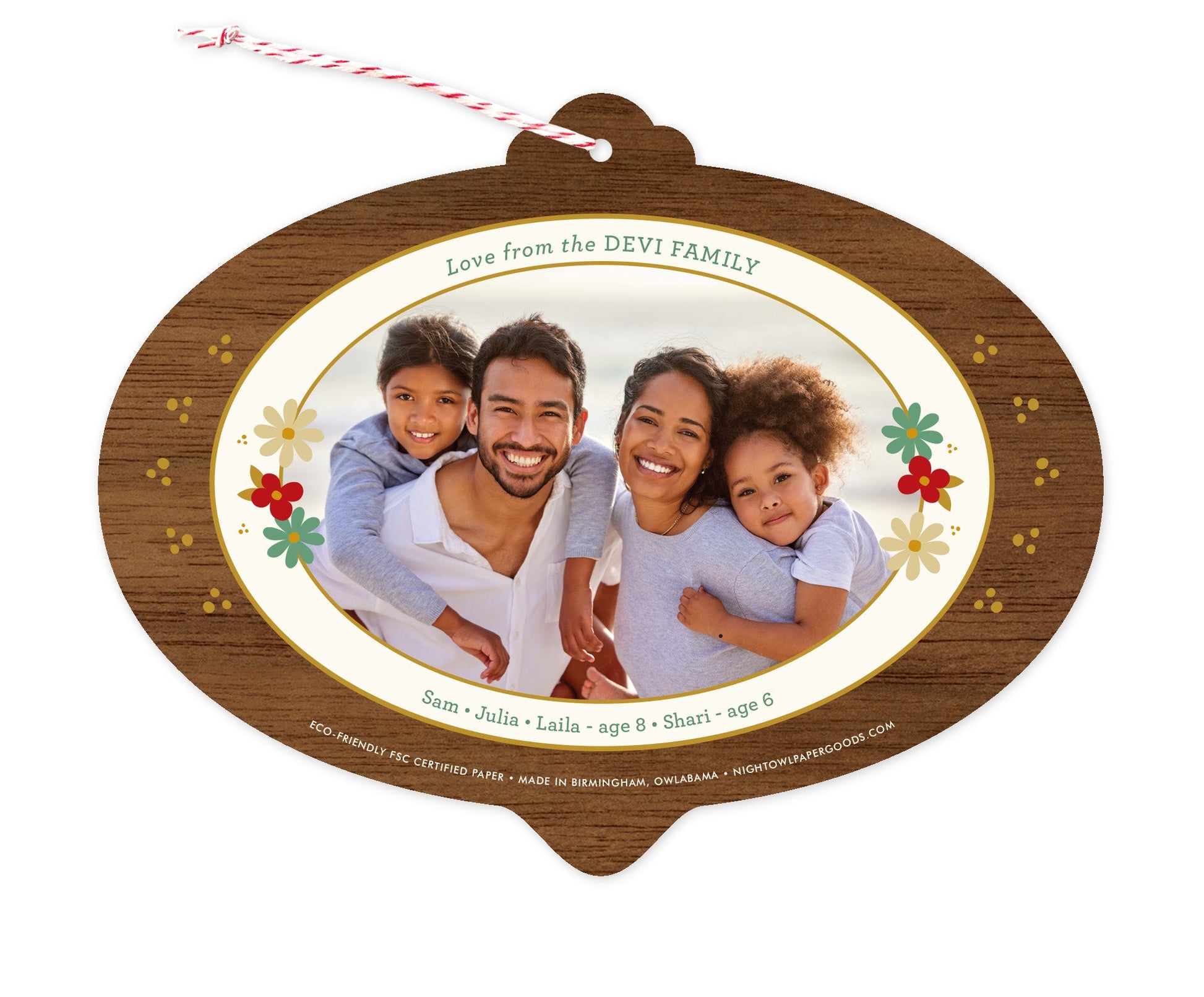 Celebrate the season with our Peace Bulb Walnut holiday ornament cards featuring festive florals adorning a peace sign and the words “peace, love, joy, happiness” on a printed walnut wood grain background. Add your custom text and/or photo to the back. Printed on your choice of real wood or eco-friendly paper, these custom ornament cards are simple to customize and perfect for sending warm wishes to family, friends and coworkers. To get started: