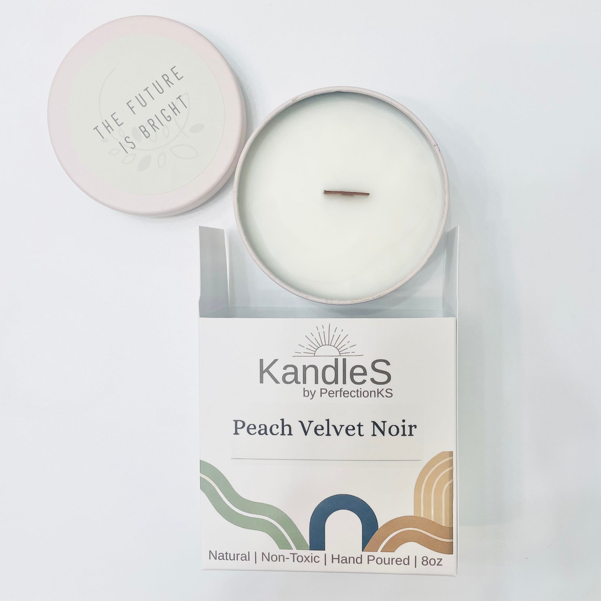 The Peach Velvet Noir Luxury Candle blends ripe peaches, creamy buttercream, and warm vanilla musk to create a sultry, romantic fragrance. Perfect for winding down, date nights at home, or adding a cozy, elegant ambiance to your bedroom or living space.
