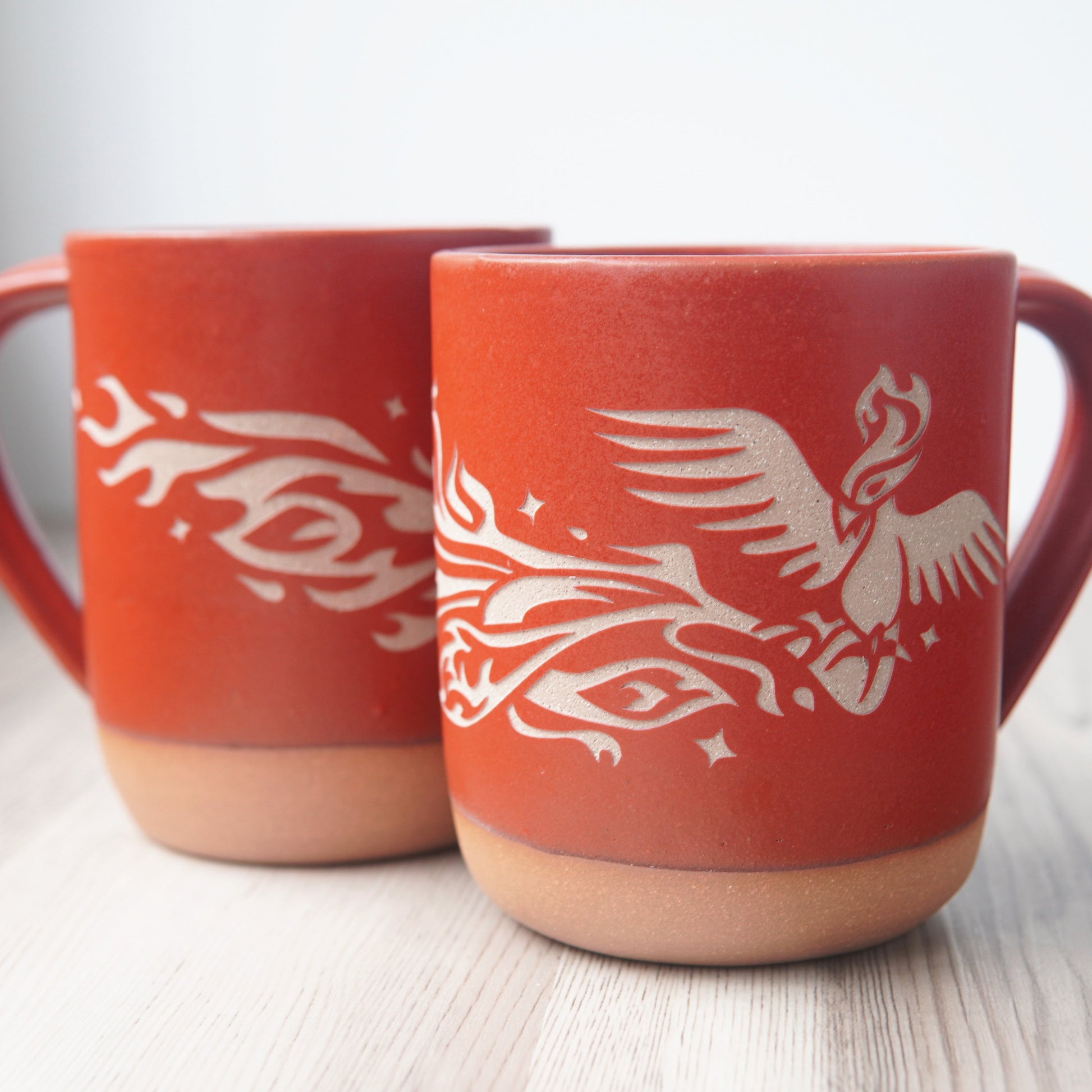 The engraved design on this handmade pottery mug is inspired by the mythical flaming phoenix, a legendary bird known for its fiery rebirth from the ashes. This ancient symbol of renewal and resurrection adds a unique and inspiring touch to your daily cup of coffee or tea routine.