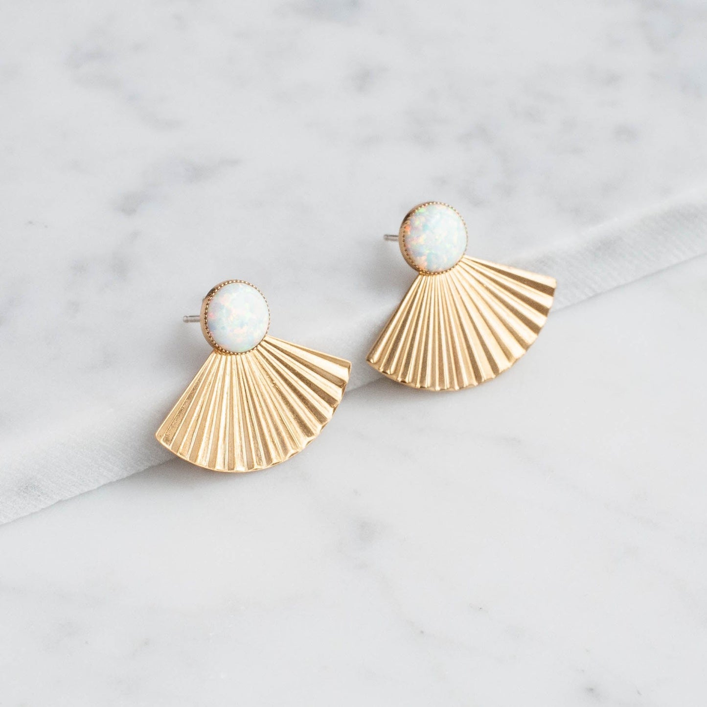 - Lab created Opal cabochons set in brass bezels with one pair of brass fan shaped pleated jackets