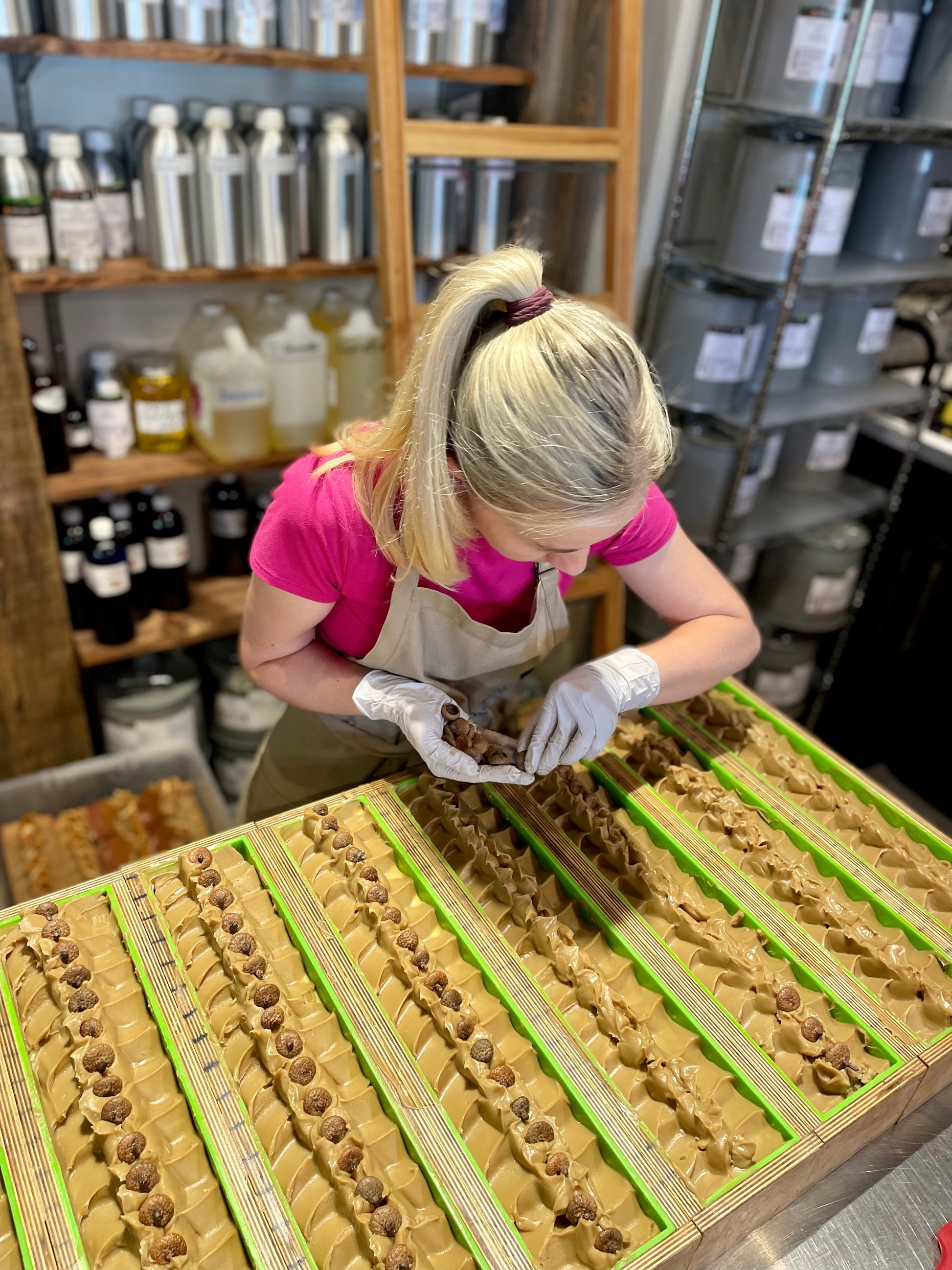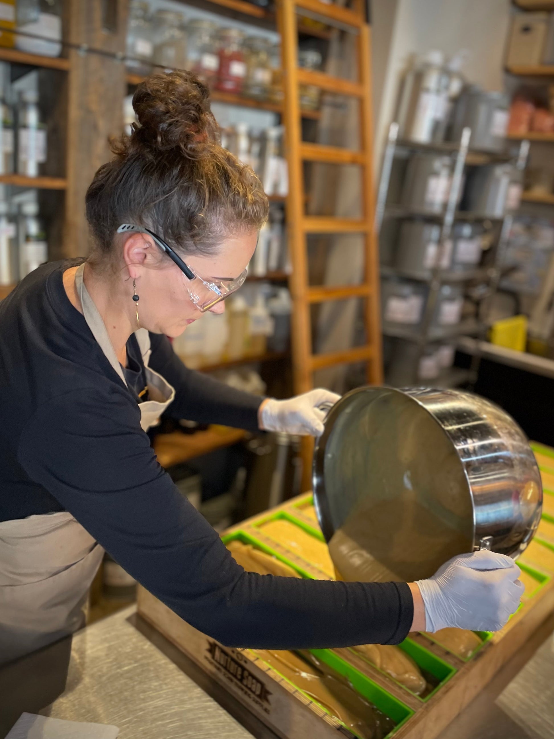 Ingredients: coconut oil, sustainable palm oil, olive oil, aloe butter, avocado oil, sodium hydroxide, distilled water, cocoa powder, safflower powder, orange & cinnamon essential oils