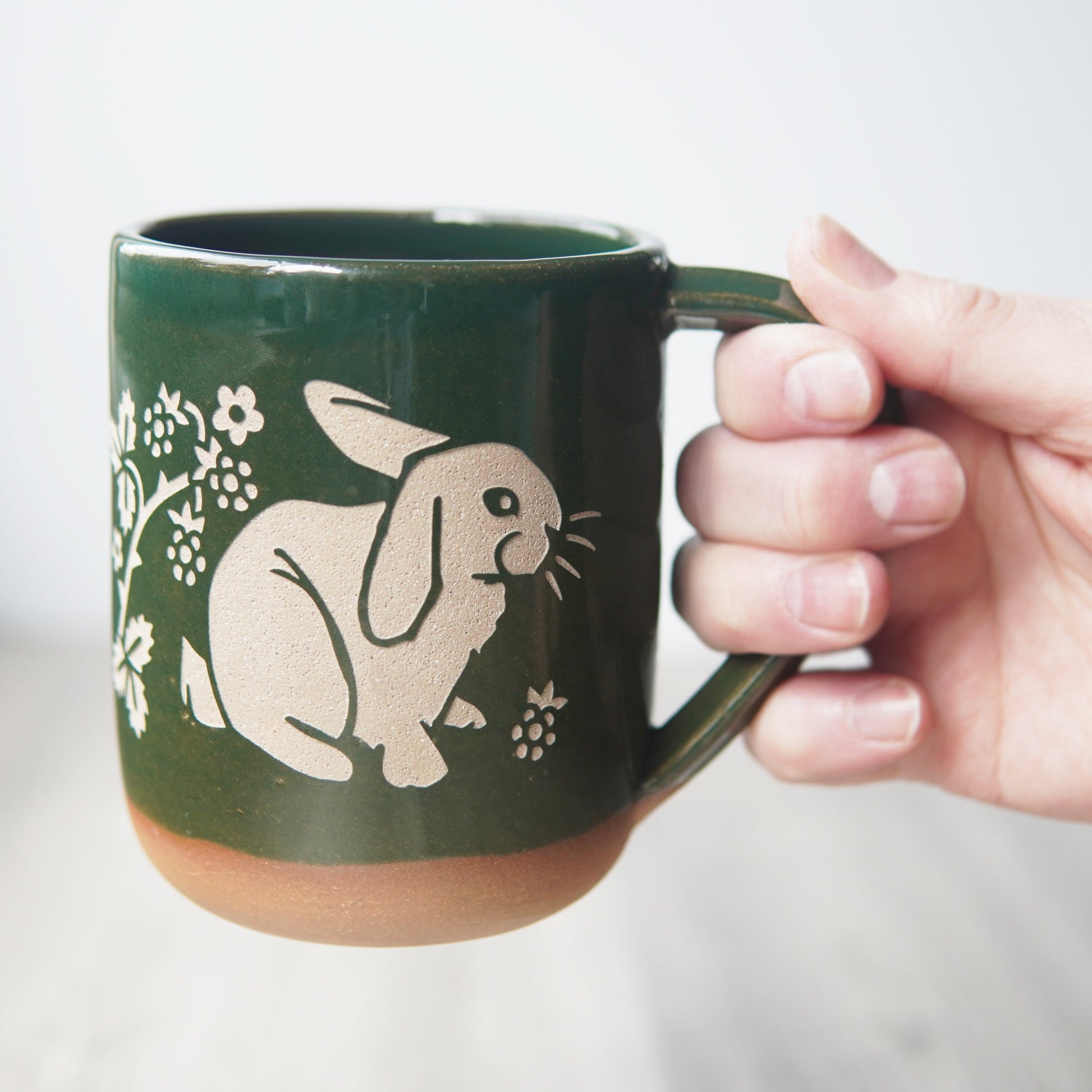 These little trickster rabbits are hanging out in their briar patch, nibbling on blackberries all day long. Their energy is abundant and fertile. Share these with someone who needs a little extra luck. *The Pine Green mug we have ready to ship holds about 20oz*